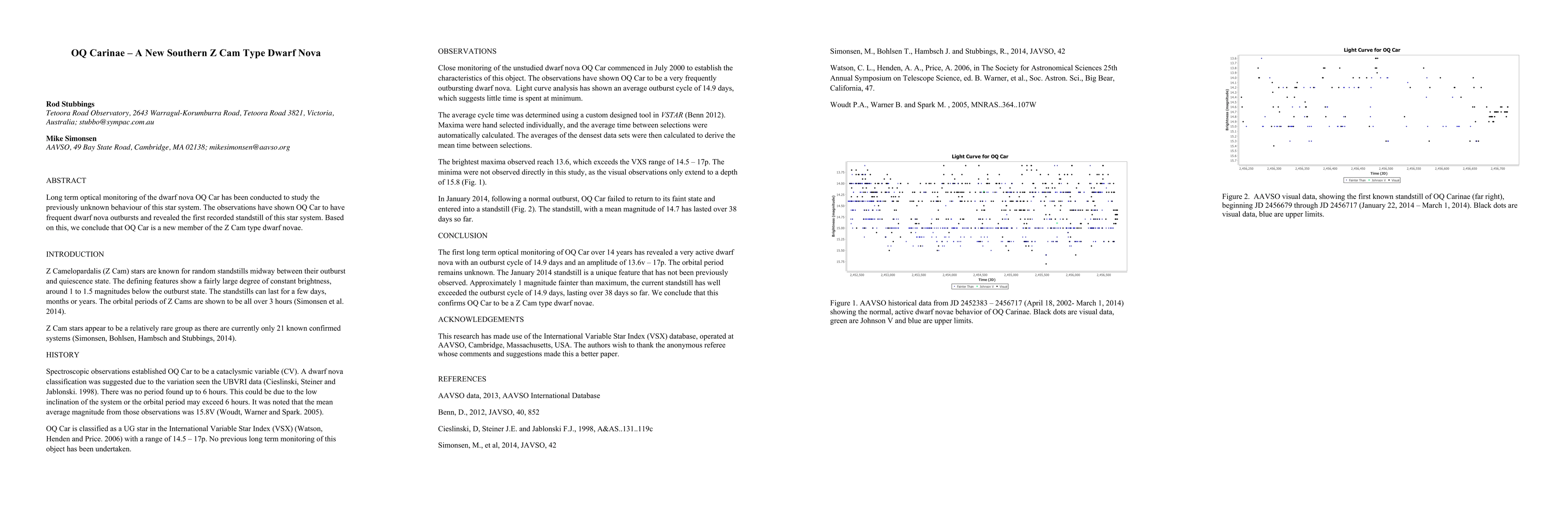 OQ Carinae (OQ Car) exhibits frequent dwarf nova outbursts and the first recorded standstill, classifying it as a new Z Cam type dwarf nova in the southern sky. This discovery expands the understanding of these unique stellar systems.