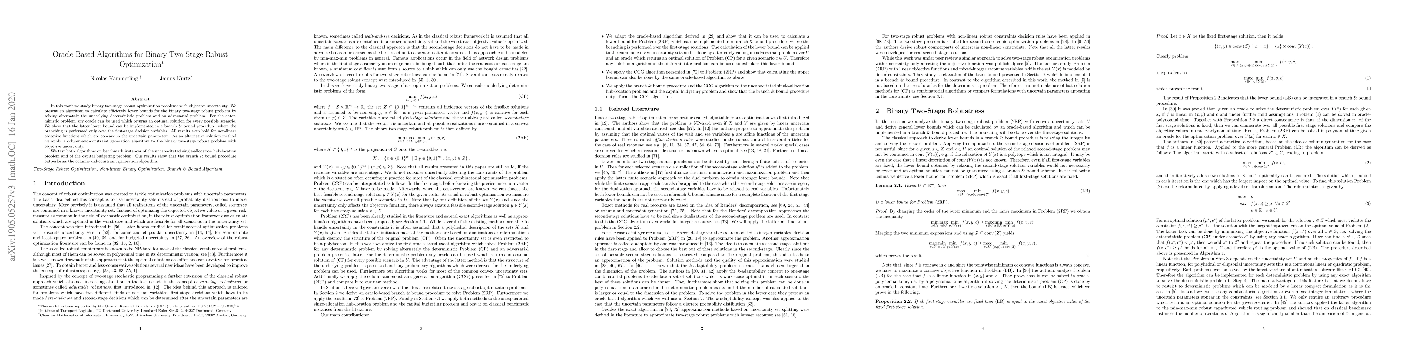 This paper proposes algorithms for binary two-stage robust optimization under objective uncertainty, utilizing a branch & bound method and a column-and-constraint generation approach. The branch & bound procedure proves more effective on benchmark problems such as the uncapacitated single-allocation hub-location and capital budgeting problems.
