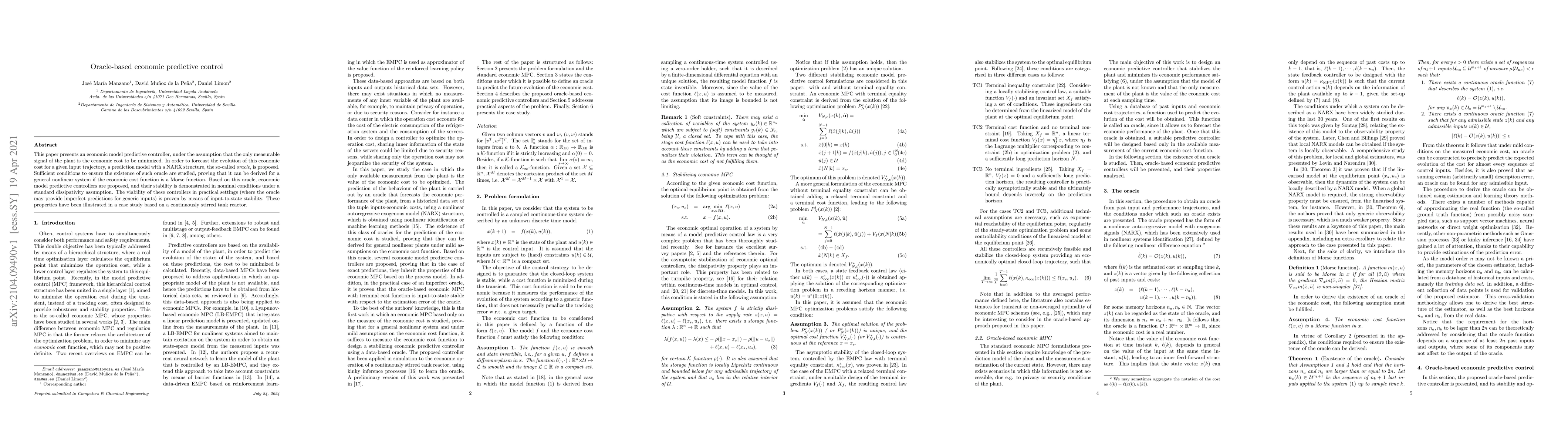 This paper presents an economic model predictive controller, under the assumption that the only measurable signal of the plant is the economic cost to be minimized. In order to forecast the evolution of this economic cost for a given input trajectory, a prediction model with a NARX structure, the so-called oracle, is proposed. Sufficient conditions to ensure the existence of such oracle are studied, proving that it can be derived for a general nonlinear system if the economic cost function is a Morse function. Based on this oracle, economic model predictive controllers are proposed, and their stability is demonstrated in nominal conditions under a standard dissipativity assumption. The viability of these controllers in practical settings (where the oracle may provide imperfect predictions for generic inputs) is proven by means of input-to-state stability. These properties have been illustrated in a case study based on a continuously stirred tank reactor.