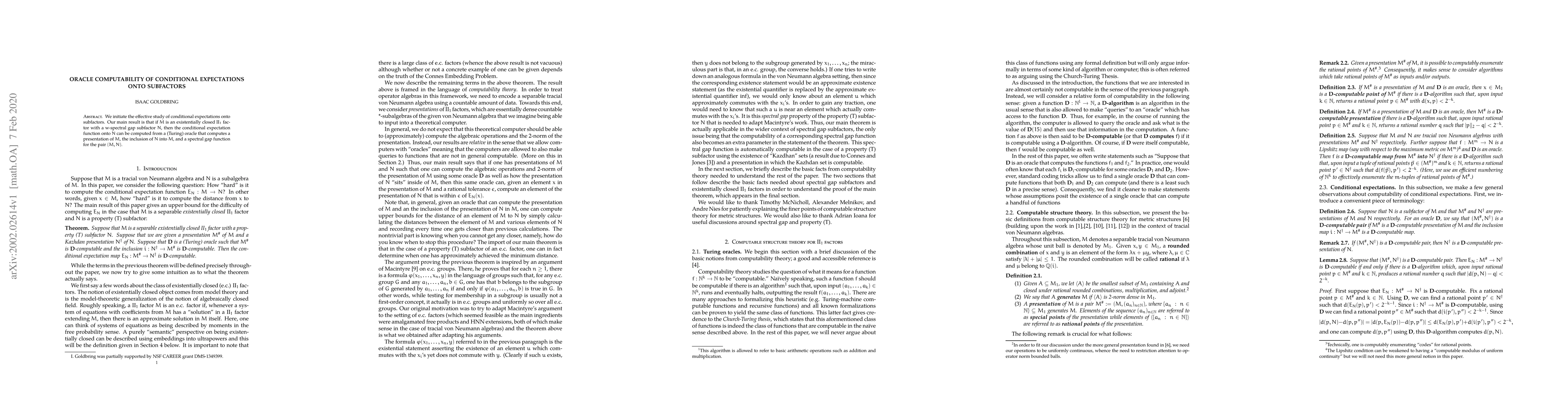 We initiate the effective study of conditional expectations onto subfactors. Our main result is that if $M$ is an existentially closed II$_1$ factor with a w-spectral gap subfactor $N$, then the conditional expectation function onto $N$ can be computed from a (Turing) oracle that computes a presentation of $M$, the inclusion of $N$ into $M$, and a spectral gap function for the pair $(M,N)$.