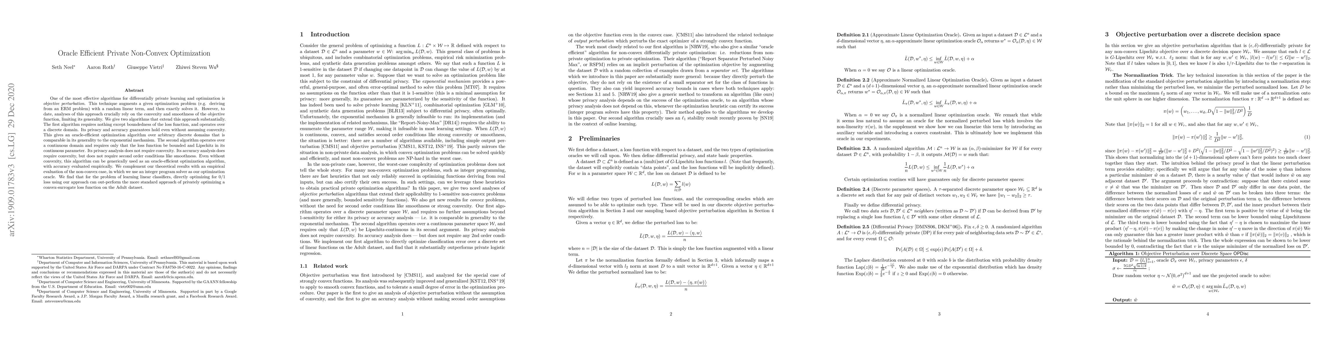 One of the most effective algorithms for differentially private learning and optimization is objective perturbation. This technique augments a given optimization problem (e.g. deriving from an ERM problem) with a random linear term, and then exactly solves it. However, to date, analyses of this approach crucially rely on the convexity and smoothness of the objective function, limiting its generality. We give two algorithms that extend this approach substantially. The first algorithm requires nothing except boundedness of the loss function, and operates over a discrete domain. Its privacy and accuracy guarantees hold even without assuming convexity. This gives an oracle-efficient optimization algorithm over arbitrary discrete domains that is comparable in its generality to the exponential mechanism. The second algorithm operates over a continuous domain and requires only that the loss function be bounded and Lipschitz in its continuous parameter. Its privacy analysis does not require convexity. Its accuracy analysis does require convexity, but does not require second order conditions like smoothness. Even without convexity, this algorithm can be generically used as an oracle-efficient optimization algorithm, with accuracy evaluated empirically. We complement our theoretical results with an empirical evaluation of the non-convex case, in which we use an integer program solver as our optimization oracle. We find that for the problem of learning linear classifiers, directly optimizing for 0/1 loss using our approach can out-perform the more standard approach of privately optimizing a convex-surrogate loss function on the Adult dataset.