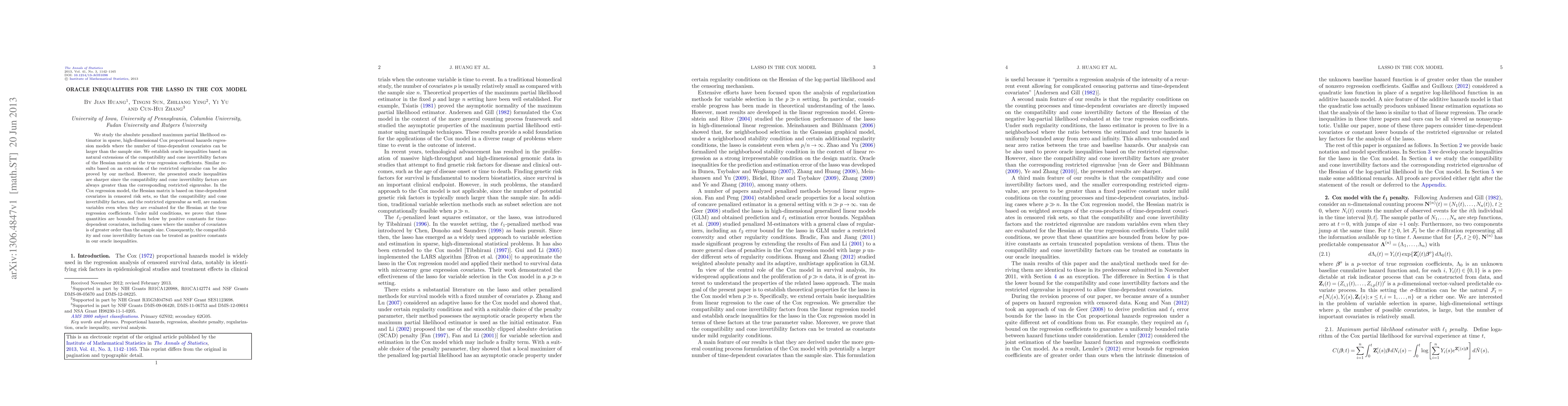 We study the absolute penalized maximum partial likelihood estimator in sparse, high-dimensional Cox proportional hazards regression models where the number of time-dependent covariates can be larger than the sample size. We establish oracle inequalities based on natural extensions of the compatibility and cone invertibility factors of the Hessian matrix at the true regression coefficients. Similar results based on an extension of the restricted eigenvalue can be also proved by our method. However, the presented oracle inequalities are sharper since the compatibility and cone invertibility factors are always greater than the corresponding restricted eigenvalue. In the Cox regression model, the Hessian matrix is based on time-dependent covariates in censored risk sets, so that the compatibility and cone invertibility factors, and the restricted eigenvalue as well, are random variables even when they are evaluated for the Hessian at the true regression coefficients. Under mild conditions, we prove that these quantities are bounded from below by positive constants for time-dependent covariates, including cases where the number of covariates is of greater order than the sample size. Consequently, the compatibility and cone invertibility factors can be treated as positive constants in our oracle inequalities.