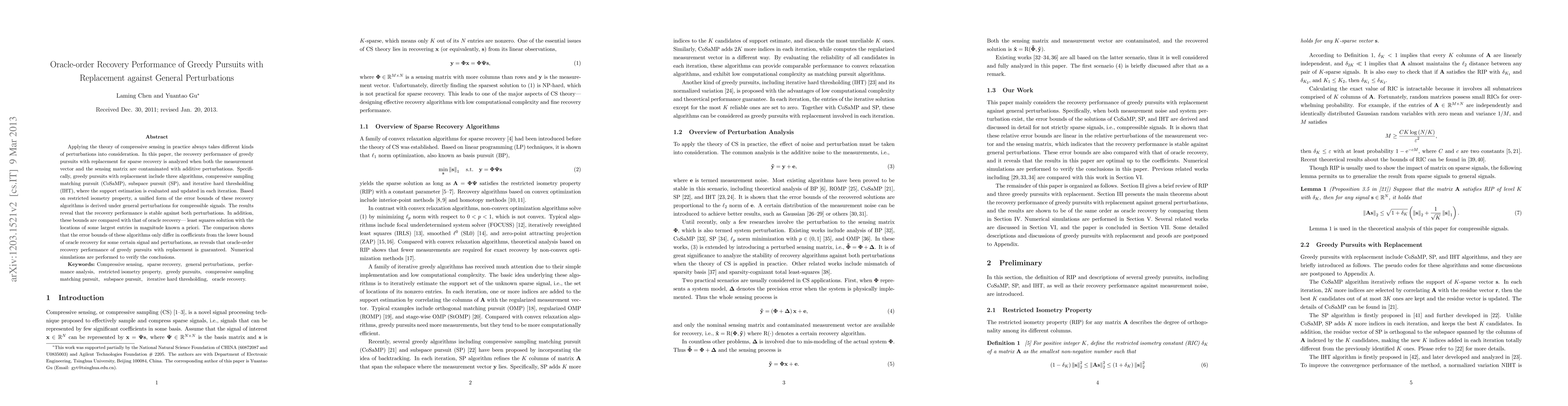 This paper analyzes the performance of greedy pursuits with replacement, including CoSaMP, SP, and IHT, under general perturbations in compressive sensing. It derives error bounds showing stable recovery performance and demonstrates that these algorithms achieve oracle-order recovery performance, differing only by coefficients from the oracle recovery lower bound. Numerical simulations confirm these theoretical findings.