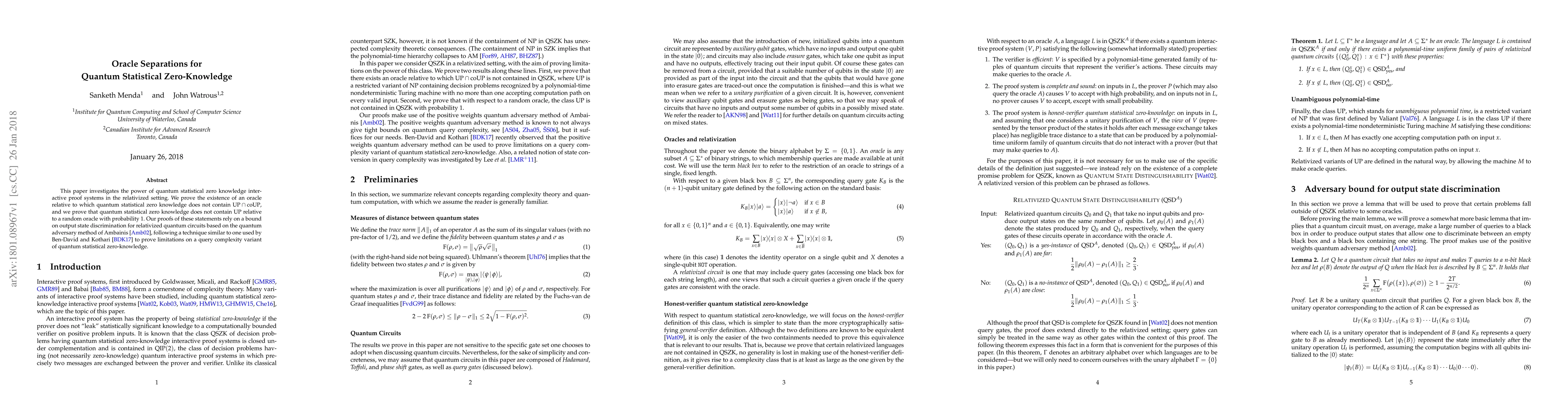 This paper demonstrates oracle separations for quantum statistical zero-knowledge, proving that quantum statistical zero-knowledge does not encompass UP intersect coUP in a relativized setting. It also shows that quantum statistical zero-knowledge does not contain UP with probability 1 against random oracles, using a bound on output state discrimination based on the quantum adversary method.
