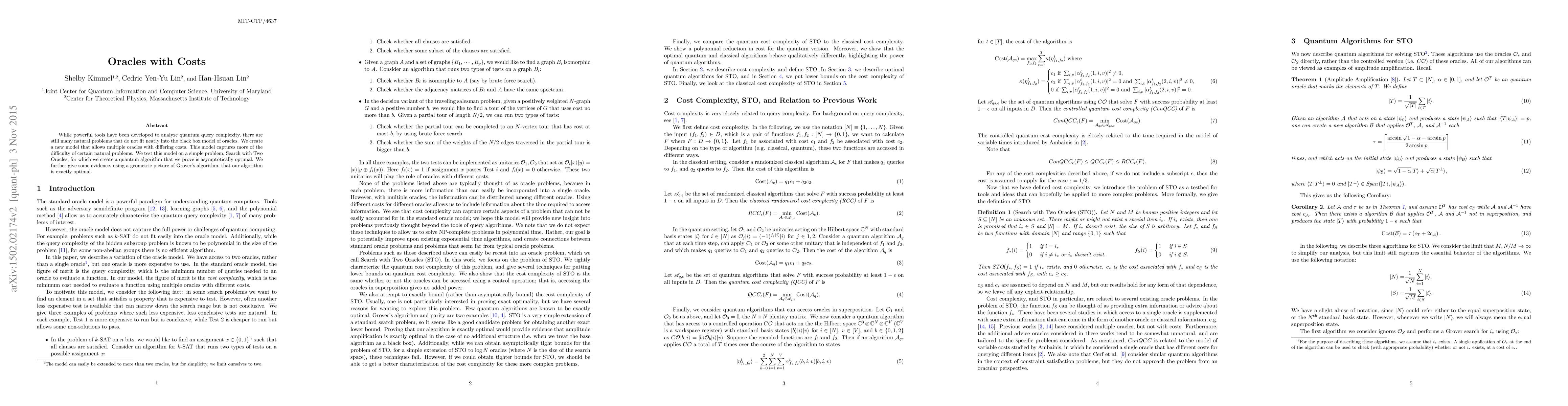 The paper introduces a new model for oracles with costs, extending the standard query model to better capture the complexity of certain natural problems. It tests this model on a simple problem, Search with Two Oracles, for which an asymptotically optimal quantum algorithm is developed.