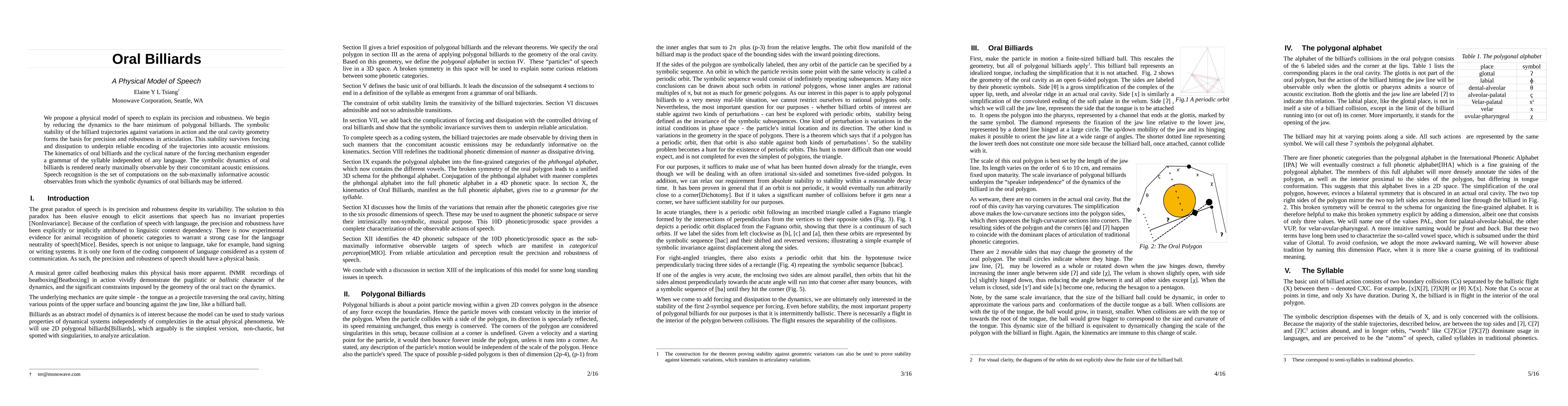 We propose a physical model of speech to explain its precision and robustness. We begin by reducing the dynamics to the bare minimum of polygonal billiards. The symbolic stability of the billiard trajectories against variations in action and the oral cavity geometry forms the basis for precision and robustness in articulation. This stability survives forcing and dissipation to underpin reliable encoding of the trajectories into acoustic emissions. The kinematics of oral billiards and the cyclical nature of the forcing mechanism engender a grammar of the syllable independent of any language. The symbolic dynamics of oral billiards is rendered nearly maximally observable by their concomitant acoustic emissions. Speech recognition is the set of computations on the sub-maximally informative acoustic observables from which the symbolic dynamics of oral billiards may be inferred.