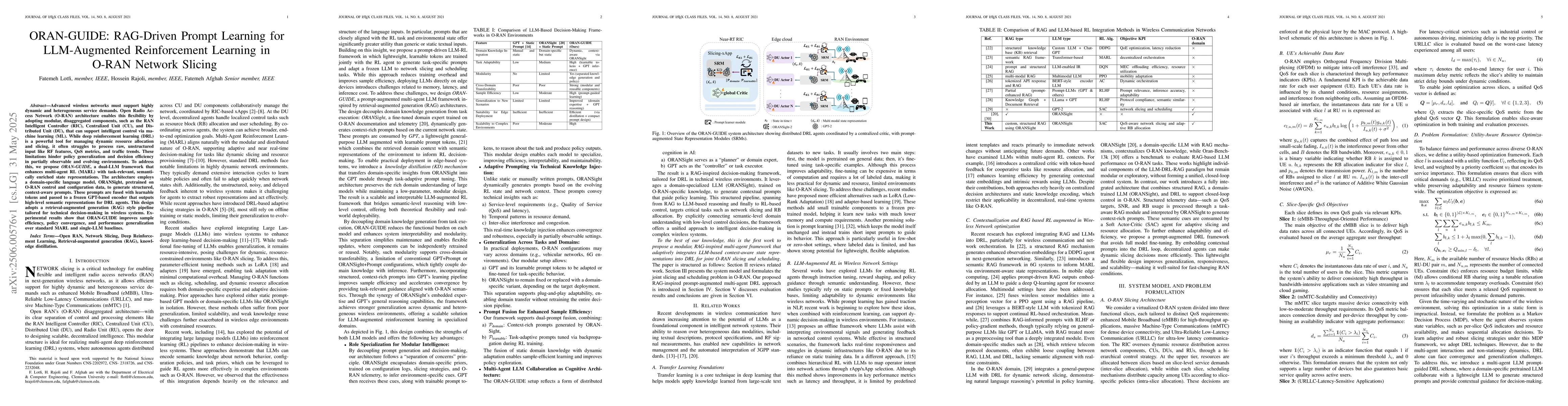 ORAN-GUIDE differentiates itself by combining retrieval-augmented generation with reinforcement learning in the context of O-RAN, specifically addressing the challenge of processing unstructured input for efficient decision-making in wireless systems.