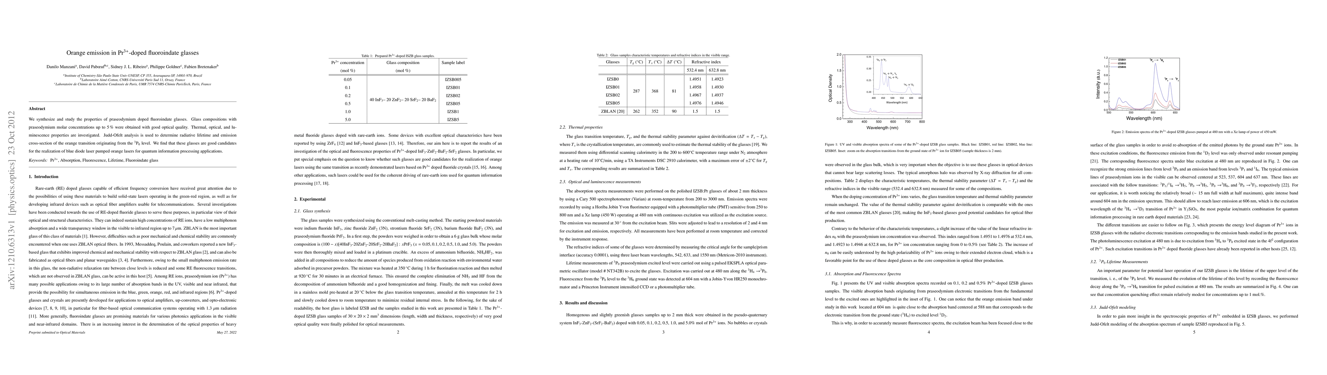 We synthesize and study the properties of praseodymium doped fluoroindate glasses. Glass compositions with praseodymium molar concentrations up to 5% were obtained with good optical quality. Thermal, optical, and luminescence properties are investigated. Judd-Ofelt analysis is used to determine radiative lifetime and emission cross-section of the orange transition originating from the 3P0 level. We find that these glasses are good candidates for the realization of blue diode laser pumped orange lasers for quantum information processing applications.