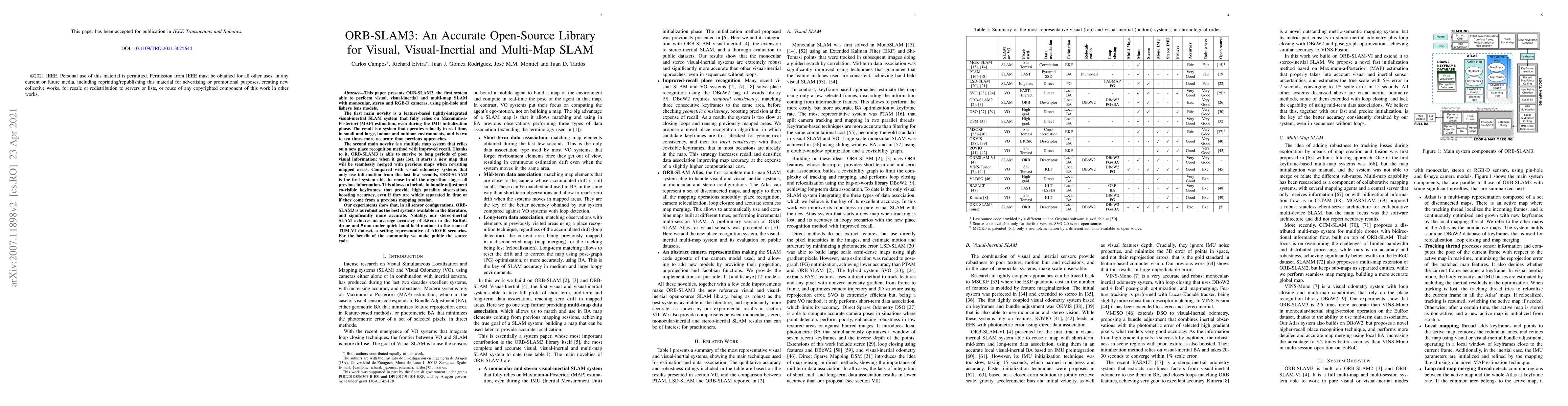 ORB-SLAM3 is an advanced open-source library for visual, visual-inertial, and multi-map SLAM, offering robust real-time performance and significantly higher accuracy compared to previous methods. It integrates tightly-coupled visual-inertial SLAM and multiple map management with improved place recognition, enabling seamless map merging and enhanced accuracy through the reuse of historical data.