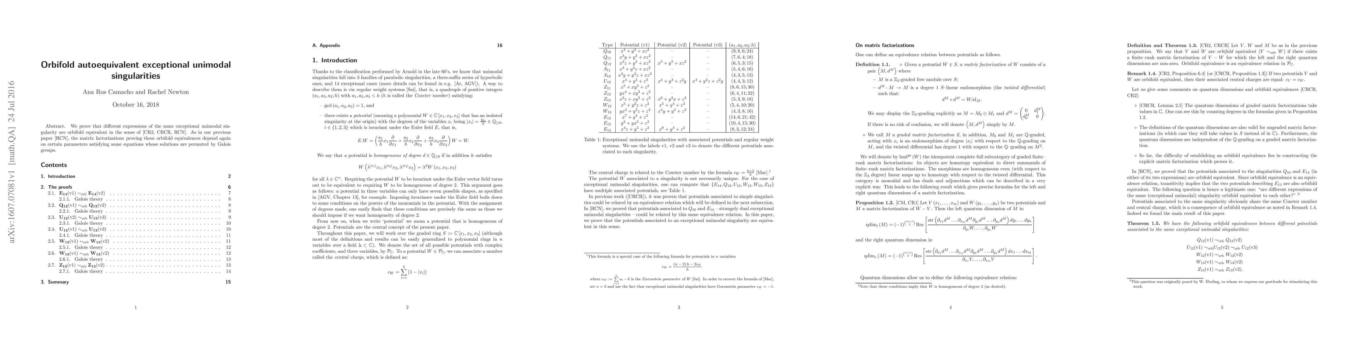 This paper demonstrates that various representations of the same exceptional unimodal singularity are orbifold equivalent, with the matrix factorizations underpinning these equivalences relying on parameters governed by specific equations, whose solutions are permuted by Galois groups.