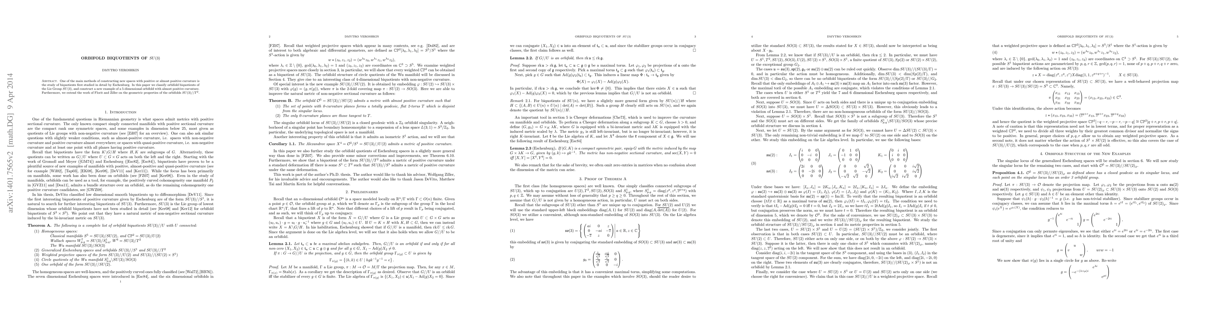 One of the main methods of constructing new spaces with positive or almost positive curvature is the study of biquotients first studied in detail by Eschenburg. We classify orbifold biquotients of the Lie Group $SU(3)$, and construct a new example of a 5-dimensional orbifold with almost positive curvature. Furthermore, we extend the work of Florit and Ziller on the geometric properties of the orbifolds $SU(3)//T^2$.