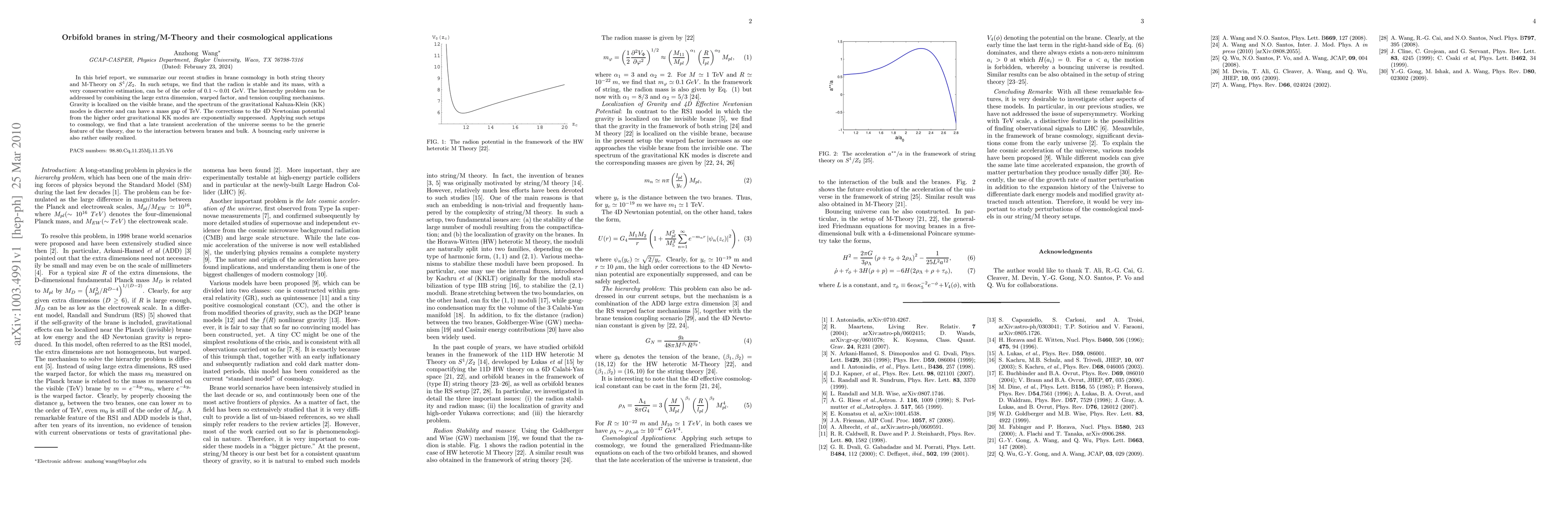 In this brief report, we summarize our recent studies in brane cosmology in both string theory and M-Theory on $S^{1}/Z_{2}$. In such setups, we find that the radion is stable and its mass, with a very conservative estimation, can be of the order of $0. 1 \sim 0.01$ GeV. The hierarchy problem can be addressed by combining the large extra dimension, warped factor, and tension coupling mechanisms. Gravity is localized on the visible brane, and the spectrum of the gravitational Kaluza-Klein (KK) modes is discrete and can have a mass gap of TeV. The corrections to the 4D Newtonian potential from the higher order gravitational KK modes are exponentially suppressed. Applying such setups to cosmology, we find that a late transient acceleration of the universe seems to be the generic feature of the theory, due to the interaction between branes and bulk. A bouncing early universe is also rather easily realized.