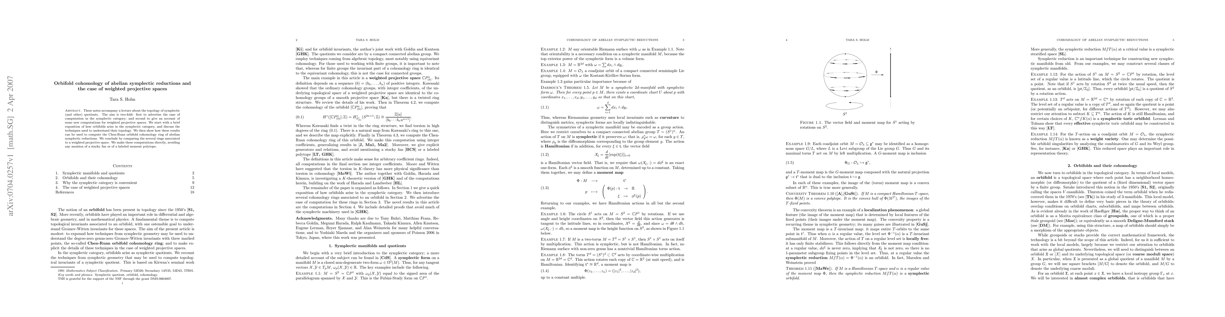 This paper discusses the computation of orbifold cohomology for abelian symplectic reductions, focusing on the topology of quotients. It introduces techniques for understanding the orbifold cohomology of weighted projective spaces, providing new computations without relying on stacky fans or moment polytopes.