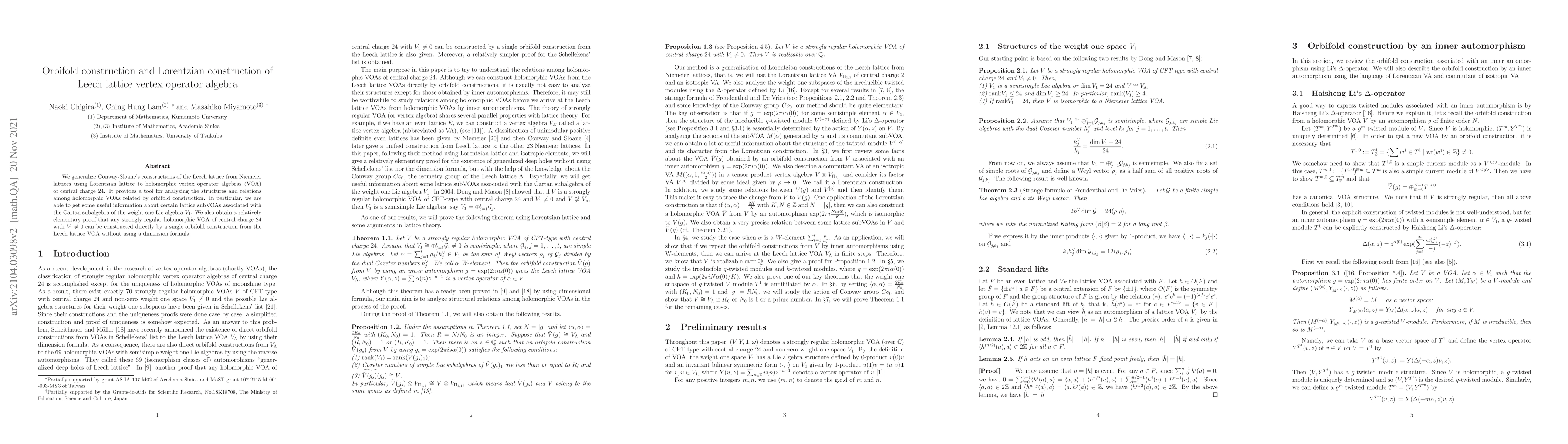 We generalize Conway-Sloane's constructions of the Leech lattice from Niemeier lattices using Lorentzian lattice to holomorphic vertex operator algebras (VOA) of central charge 24. It provides a tool for analyzing the structures and relations among holomorphic VOAs related by orbifold construction. In particular, we are able to get some useful information about certain lattice subVOAs associated with the Cartan subalgebra of the weight one Lie algebra. We also obtain a relatively elementary proof that any strongly regular holomorphic VOA of central charge $24$ with a non-trivial weight one subspace can be constructed directly by a single orbifold construction from the Leech lattice VOA without using a dimension formula.