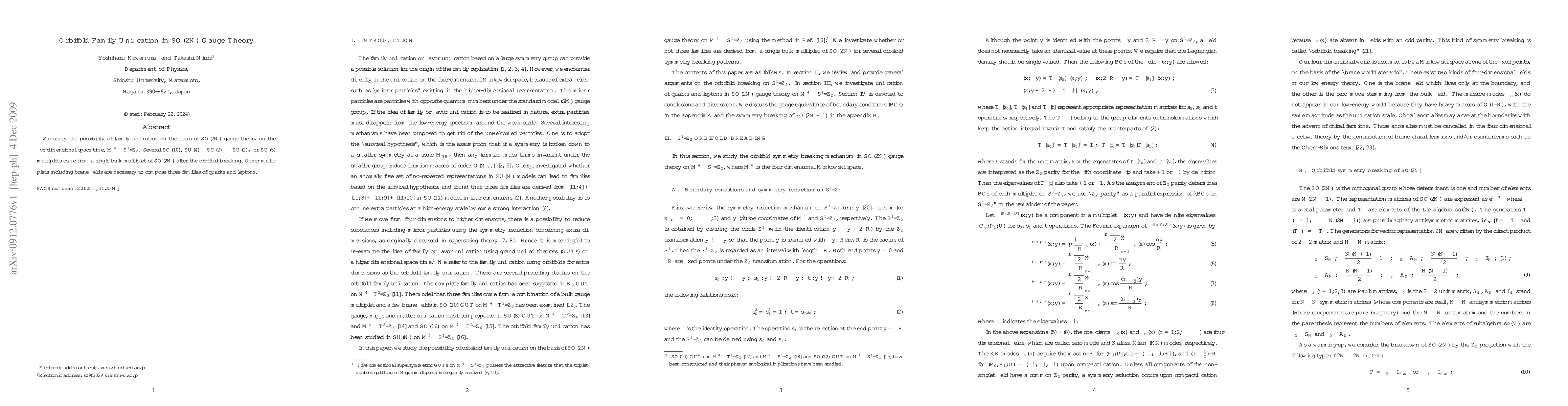 This paper explores family unification in SO(2N) gauge theory within a five-dimensional space-time, $M^4\times S^1/Z_2$, where SO(10), SU(4)$\times$SU(2)$_L\times$SU(2)$_R$, or SU(5) multiplets emerge from a single SO(2N) bulk multiplet post-orbifold breaking, supplemented by additional brane fields to form three families of quarks and leptons.