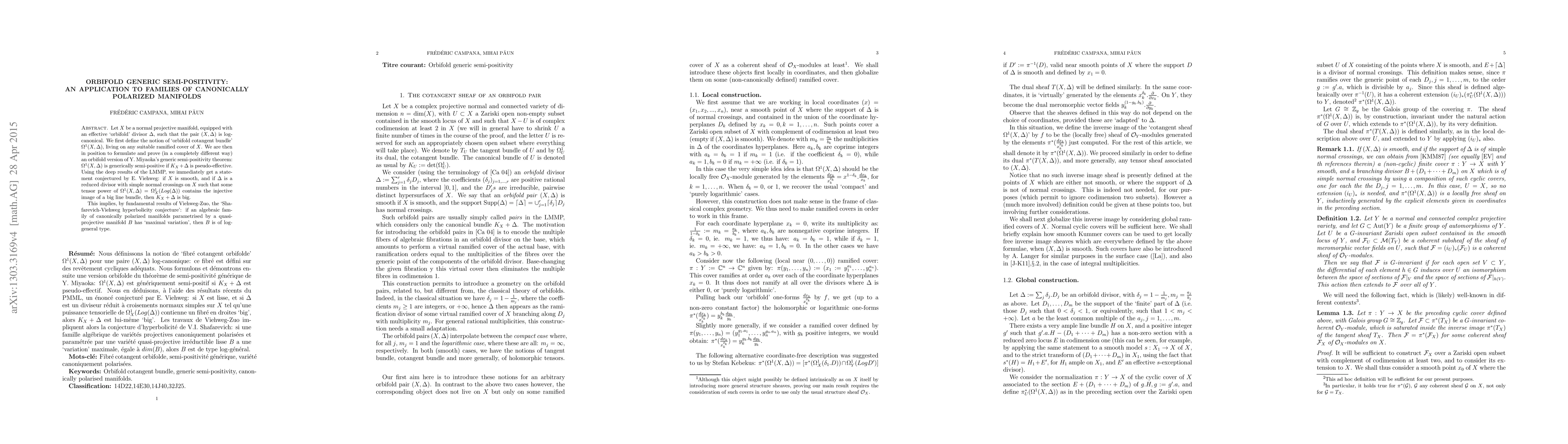 In this article we establish a version of Y. Miyaoka generic semi-positivity theorem in the context of log-canonical orbifold pairs. As an application, we show that the canonical bundle associated to a lc pair is big as soon as there exists a generically injective morphism from an ample line bundle to some symmetric power of the cotangent bundle associated to the orbifold pair.