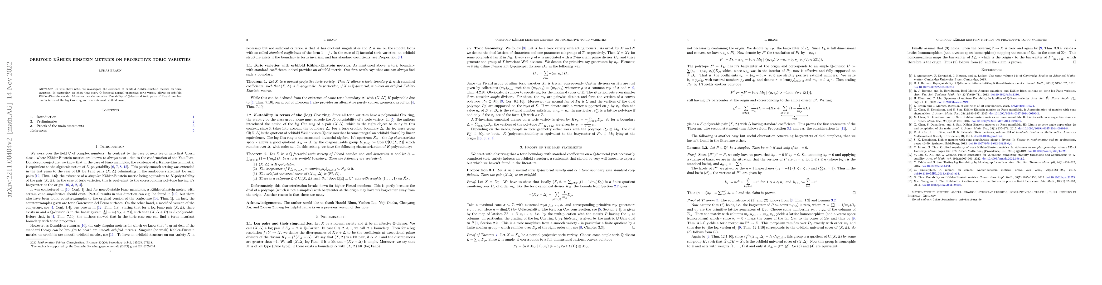 This paper demonstrates the existence of orbifold Kähler-Einstein metrics on $\mathbb{Q}$-factorial normal projective toric varieties, and characterizes the K-stability of $\mathbb{Q}$-factorial toric pairs with Picard number one via the log Cox ring and universal orbifold cover.