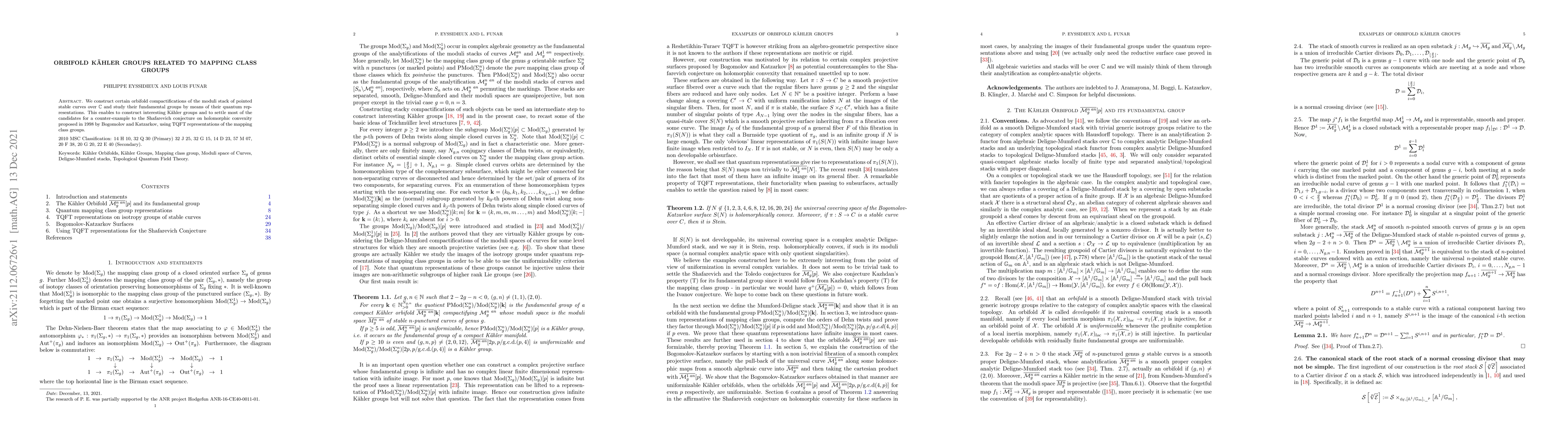 We construct certain orbifold compactifications of the moduli stack of pointed stable curves over $\mathbb C$ and study their fundamental groups by means of their quantum representations. This enables to construct interesting K\"ahler groups and to settle most of the candidates for a counter-example to the Shafarevich conjecture on holomorphic convexity proposed in 1998 by Bogomolov and Katzarkov, using TQFT representations of the mapping class groups.