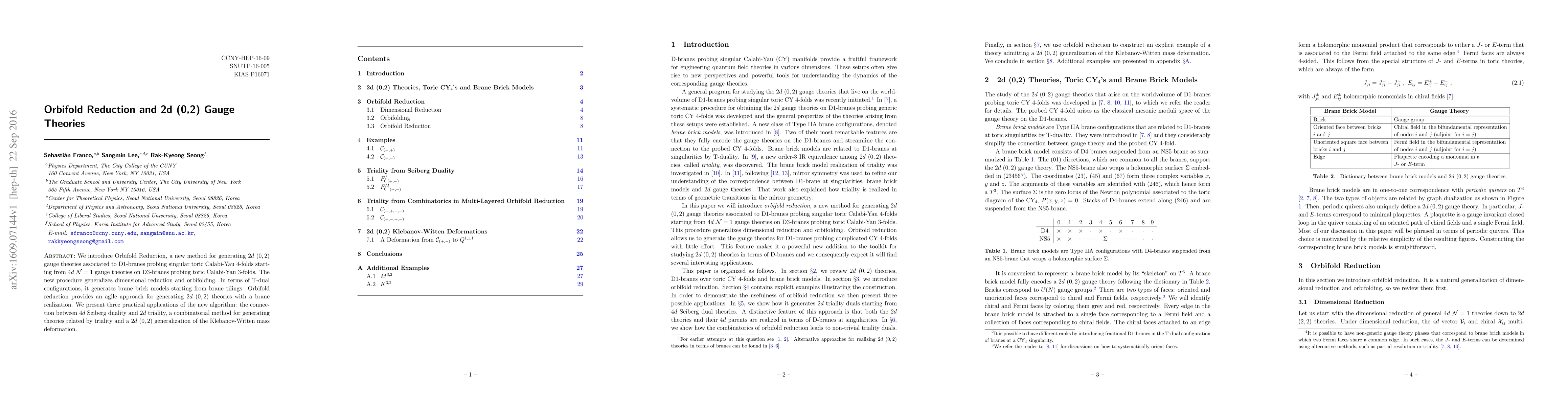 We introduce Orbifold Reduction, a new method for generating $2d$ $(0,2)$ gauge theories associated to D1-branes probing singular toric Calabi-Yau 4-folds starting from $4d$ $\mathcal{N}=1$ gauge theories on D3-branes probing toric Calabi-Yau 3-folds. The new procedure generalizes dimensional reduction and orbifolding. In terms of T-dual configurations, it generates brane brick models starting from brane tilings. Orbifold reduction provides an agile approach for generating $2d$ $(0,2)$ theories with a brane realization. We present three practical applications of the new algorithm: the connection between $4d$ Seiberg duality and $2d$ triality, a combinatorial method for generating theories related by triality and a $2d$ $(0,2)$ generalization of the Klebanov-Witten mass deformation.