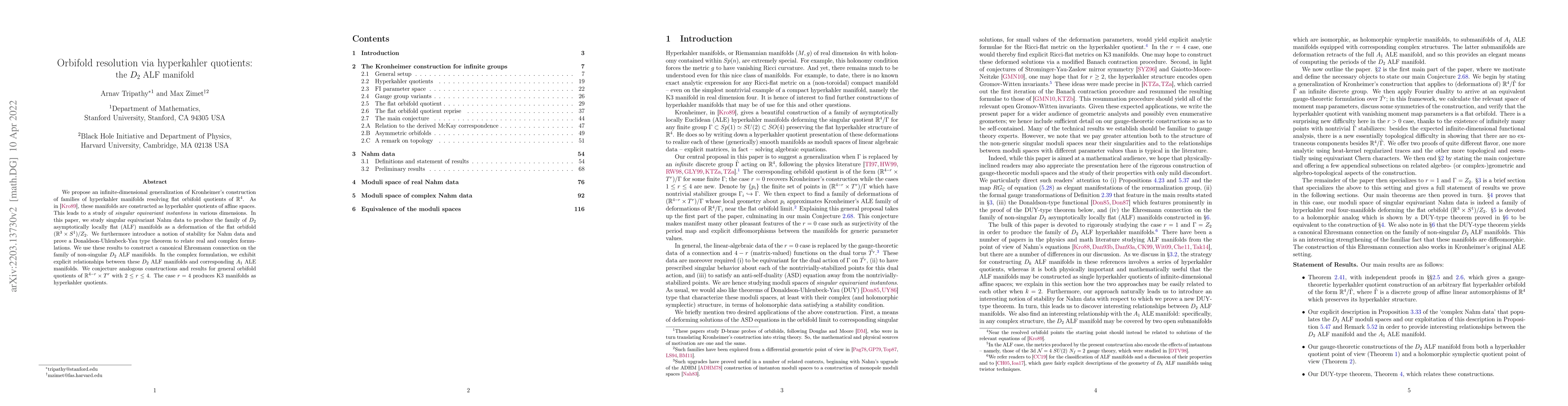 We propose an infinite-dimensional generalization of Kronheimer's construction of families of hyperkahler manifolds resolving flat orbifold quotients of $\mathbb{R}^4$. As in [Kro89], these manifolds are constructed as hyperkahler quotients of affine spaces. This leads to a study of \emph{singular equivariant instantons} in various dimensions. In this paper, we study singular equivariant Nahm data to produce the family of $D_2$ asymptotically locally flat (ALF) manifolds as a deformation of the flat orbifold $(\mathbb{R}^3 \times S^1)/Z_2$. We furthermore introduce a notion of stability for Nahm data and prove a Donaldson-Uhlenbeck-Yau type theorem to relate real and complex formulations. We use these results to construct a canonical Ehresmann connection on the family of non-singular $D_2$ ALF manifolds. In the complex formulation, we exhibit explicit relationships between these $D_2$ ALF manifolds and corresponding $A_1$ ALE manifolds. We conjecture analogous constructions and results for general orbifold quotients of $\mathbb{R}^{4-r} \times T^r$ with $2 \le r \le 4$. The case $r = 4$ produces K3 manifolds as hyperkahler quotients.