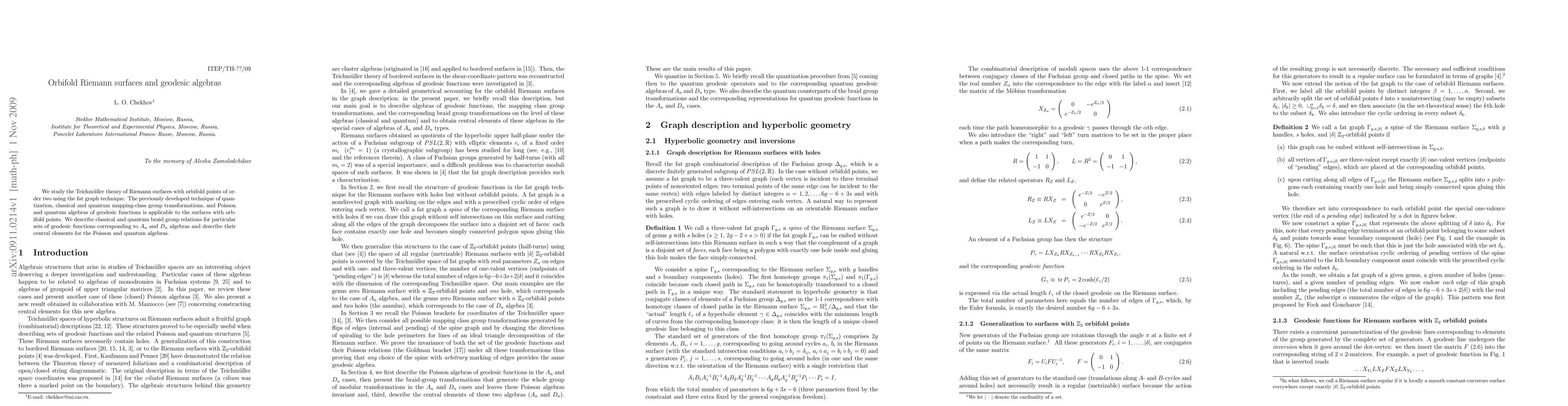 This paper explores Teichmüller theory for Riemann surfaces with order two orbifold points using fat graph techniques, and applies classical and quantum mapping-class group transformations. It examines classical and quantum braid group relations and central elements for $A_n$ and $D_n$ algebras on these surfaces.