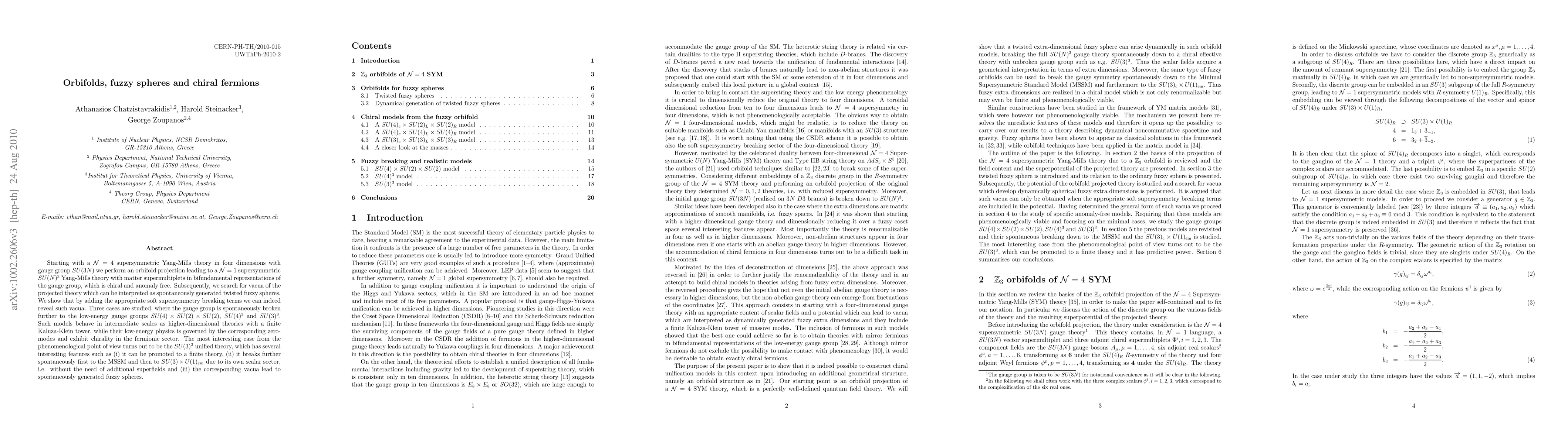 Starting with a N=4 supersymmetric Yang-Mills theory in four dimensions with gauge group SU(3N) we perform an orbifold projection leading to a N=1 supersymmetric SU(N)^3 Yang-Mills theory with matter supermultiplets in bifundamental representations of the gauge group, which is chiral and anomaly free. Subsequently, we search for vacua of the projected theory which can be interpreted as spontaneously generated twisted fuzzy spheres. We show that by adding the appropriate soft supersymmetry breaking terms we can indeed reveal such vacua. Three cases are studied, where the gauge group is spontaneously broken further to the low-energy gauge groups SU(4)xSU(2)xSU(2), SU(4)^3 and SU(3)^3. Such models behave in intermediate scales as higher-dimensional theories with a finite Kaluza-Klein tower, while their low-energy physics is governed by the corresponding zero-modes and exhibit chirality in the fermionic sector. The most interesting case from the phenomenological point of view turns out to be the SU(3)^3 unified theory, which has several interesting features such as (i) it can be promoted to a finite theory, (ii) it breaks further spontaneously first to the MSSM and then to SU(3)xU(1)_{em} due to its own scalar sector, i.e. without the need of additional superfields and (iii) the corresponding vacua lead to spontaneously generated fuzzy spheres.