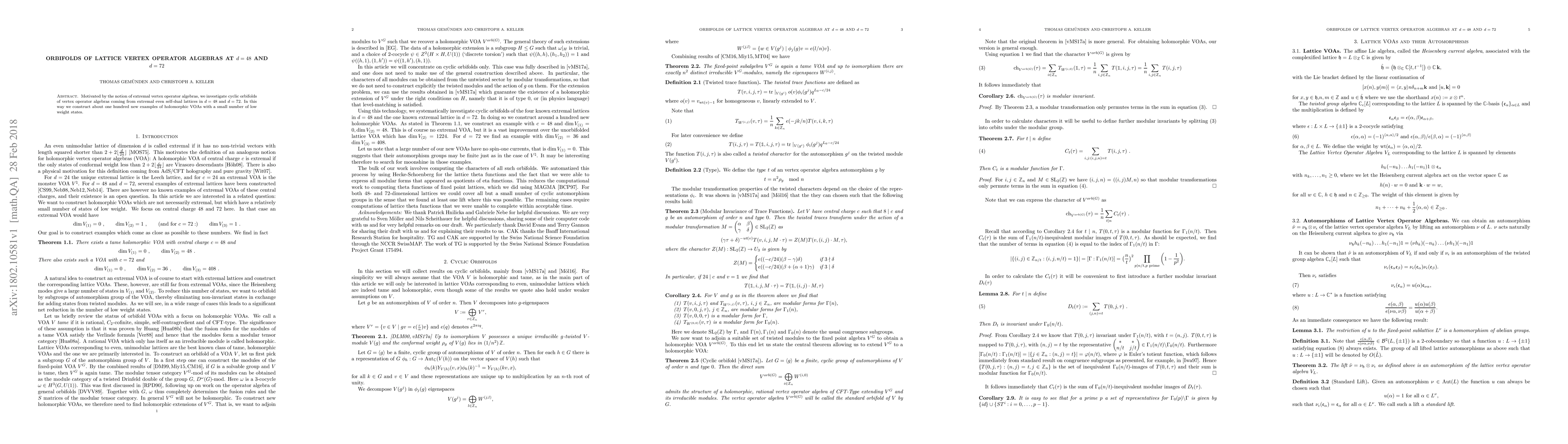This paper explores cyclic orbifolds of vertex operator algebras derived from extremal even self-dual lattices in dimensions 48 and 72, constructing around one hundred new examples of holomorphic vertex operator algebras with a limited number of low weight states.