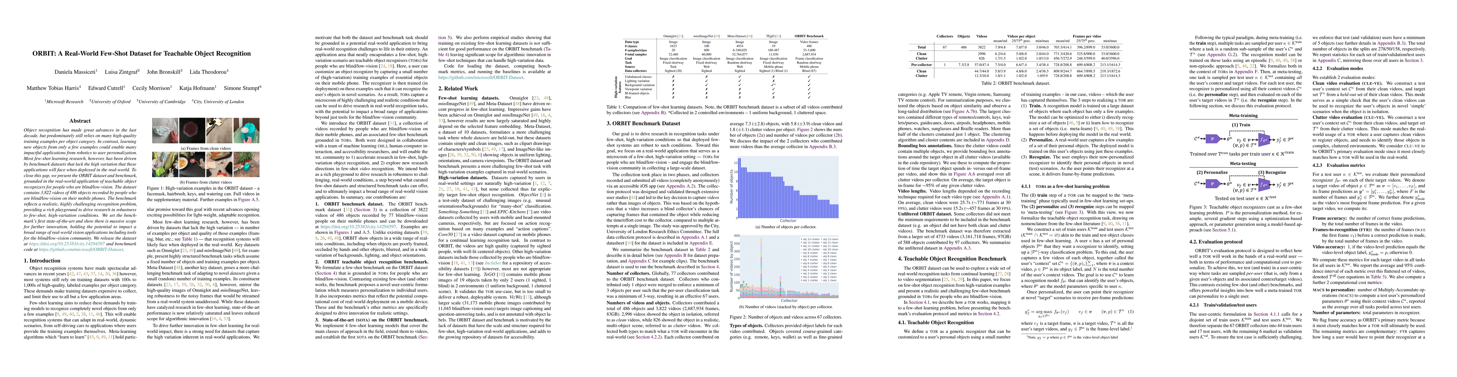 The ORBIT dataset presents a real-world few-shot learning benchmark for teachable object recognition, featuring 3,822 videos of 486 objects recorded by blind/low-vision individuals. It aims to address the lack of high-variation datasets in few-shot learning, offering a challenging environment to drive research and innovation in robust, few-shot recognition for real-world applications.