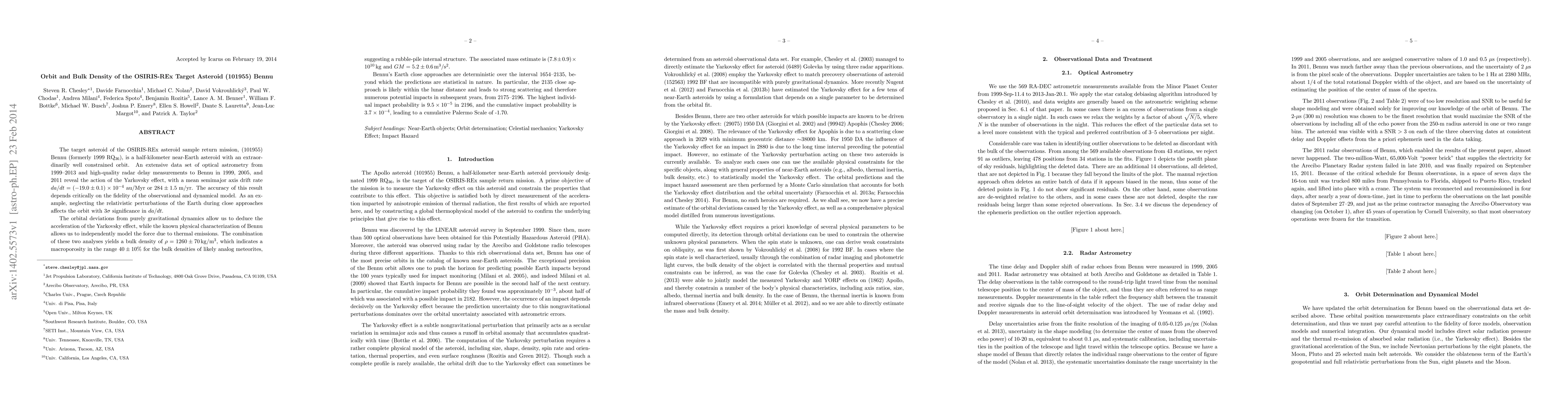 The research precisely determines the orbit and bulk density of asteroid Bennu, the target of the OSIRIS-REx mission. Utilizing optical astrometry and radar data, it finds a semimajor axis drift rate of -19.0±0.1×10^-4 au/Myr, attributing deviations to the Yarkovsky effect. This allows for a bulk density estimation of 1260±70 kg/m³, suggesting a rubble-pile internal structure. The study also predicts a potential impact risk for Earth around 2135 and subsequent years, with a cumulative Palermo Scale of -1.70.
