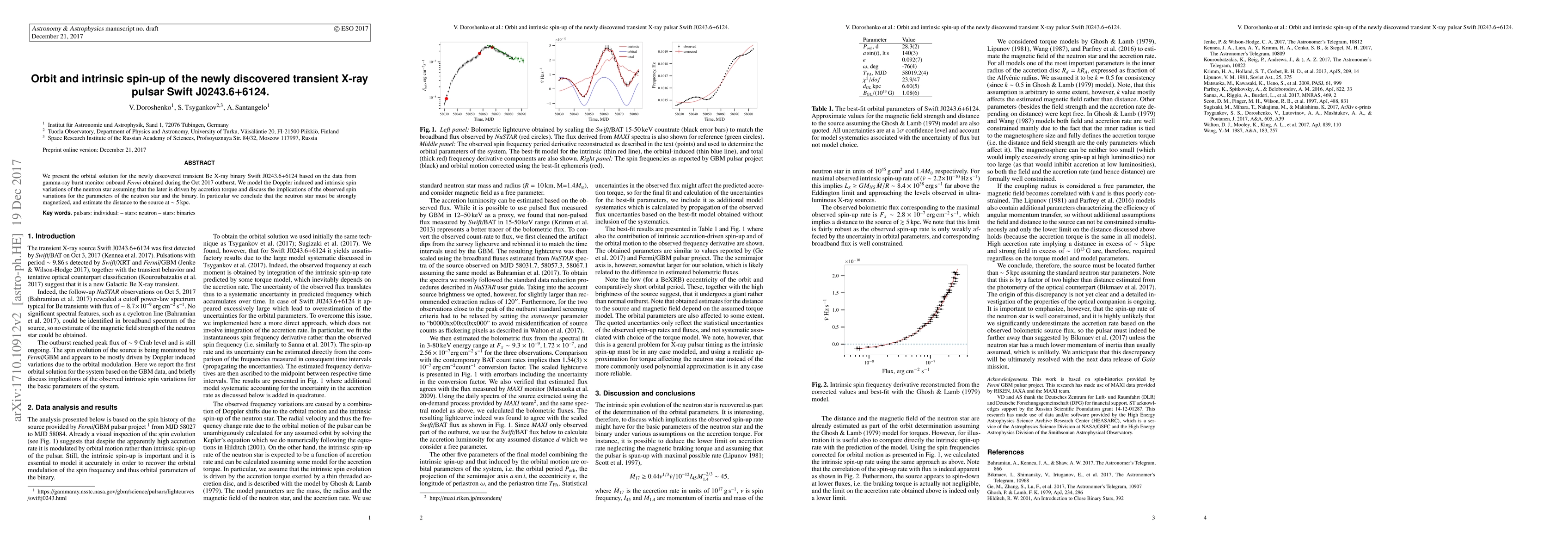 This paper presents the orbital solution for the transient Be X-ray pulsar Swift J0243.6+6124, analyzing its spin-up driven by accretion torque. The study concludes that the neutron star is strongly magnetized and estimates the distance to the source at approximately 5 kpc.