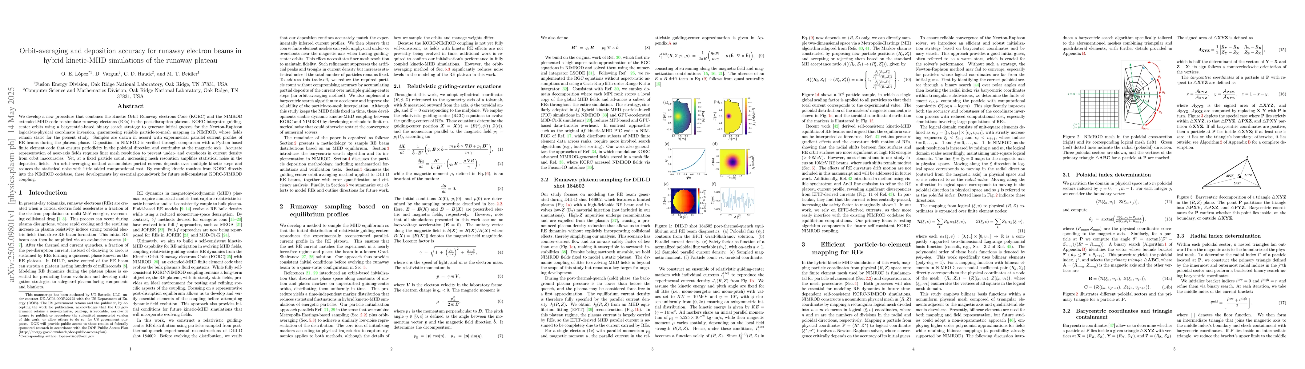 The research combines the Kinetic Orbit Runaway electrons Code (KORC) with the NIMROD extended-MHD code to simulate runaway electrons (REs) in the post-disruption plateau phase. KORC uses a barycentric-based binary search strategy for guiding-center orbit integration, ensuring reliable particle-to-mesh mapping in NIMROD, which maintains static fields in this study. Samples are drawn according to experimental parallel current profiles of RE beams during the plateau.