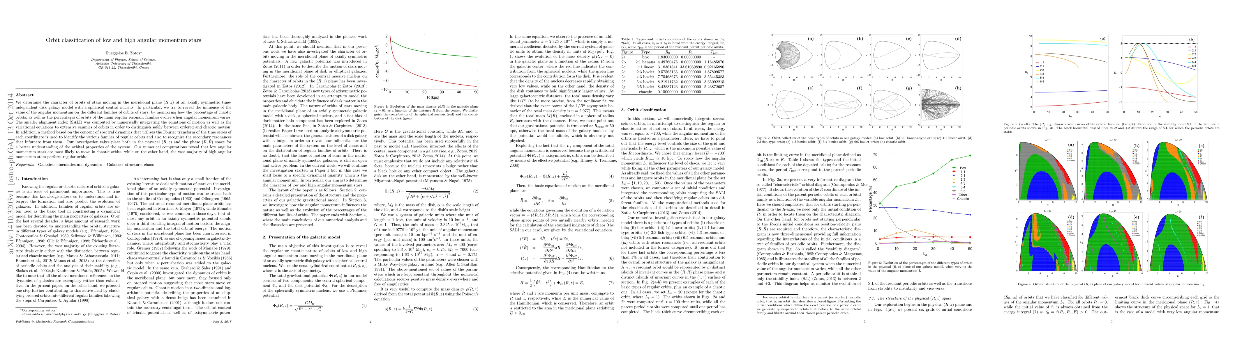 We determine the character of orbits of stars moving in the meridional plane $(R,z)$ of an axially symmetric time-independent disk galaxy model with a spherical central nucleus. In particular, we try to reveal the influence of the value of the angular momentum on the different families of orbits of stars, by monitoring how the percentage of chaotic orbits, as well as the percentages of orbits of the main regular resonant families evolve when angular momentum varies. The smaller alignment index (SALI) was computed by numerically integrating the equations of motion as well as the variational equations to extensive samples of orbits in order to distinguish safely between ordered and chaotic motion. In addition, a method based on the concept of spectral dynamics that utilizes the Fourier transform of the time series of each coordinate is used to identify the various families of regular orbits and also to recognize the secondary resonances that bifurcate from them. Our investigation takes place both in the physical $(R,z)$ and the phase $(R,\dot{R})$ space for a better understanding of the orbital properties of the system. Our numerical computations reveal that low angular momentum stars are most likely to move in chaotic orbits, while on the other hand, the vast majority of high angular momentum stars perform regular orbits.