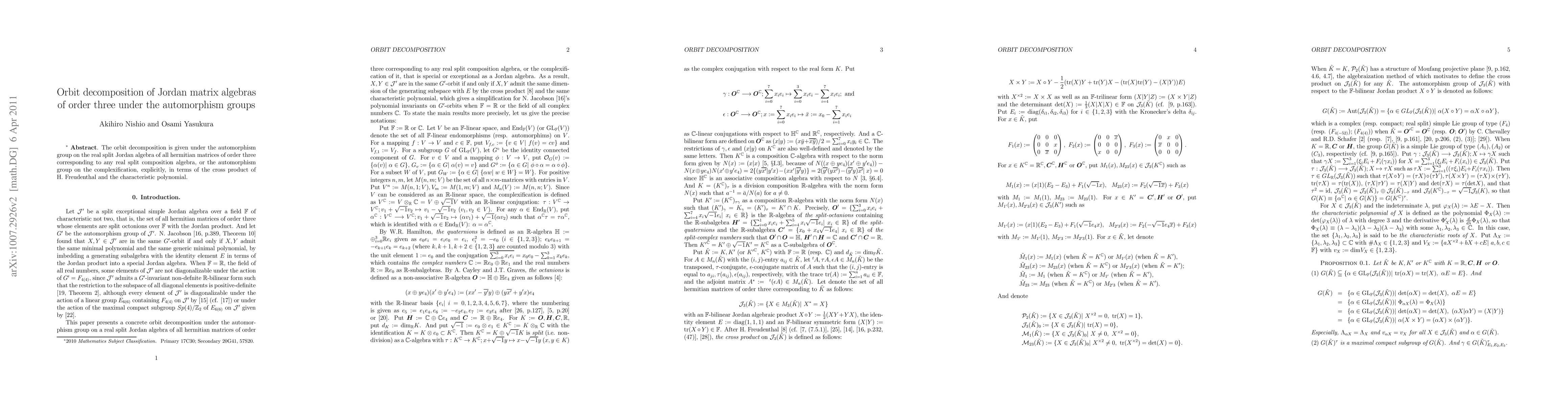 This research paper explores the orbit decomposition of Jordan matrix algebras of order three under automorphism groups, providing a clear framework for classifying these structures in terms of their characteristic polynomial and cross product with Freudenthal.