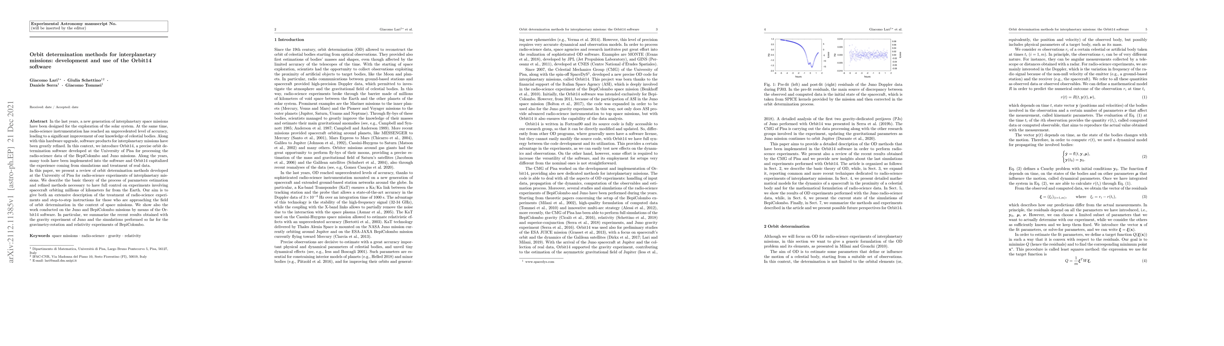 This paper reviews orbit determination methods developed at the University of Pisa for interplanetary missions, introducing Orbit14 software used for processing radio-science data from BepiColombo and Juno missions. The authors provide detailed instructions and recent results from the Juno gravity experiment and simulations for BepiColombo's gravimetry-rotation and relativity experiments.