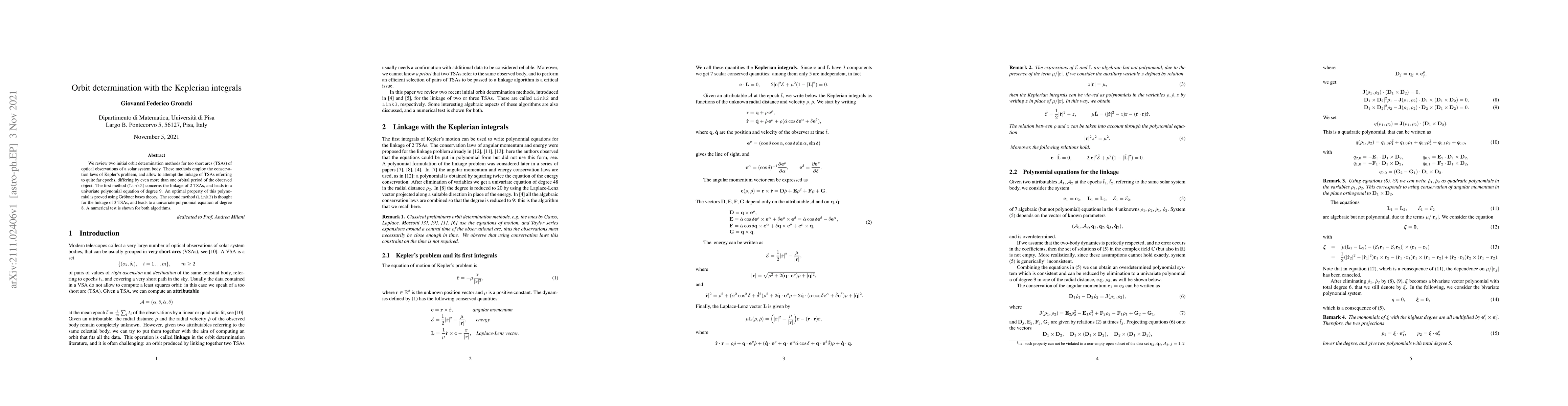 Researchers developed two orbit determination methods for short arcs of optical observations, using Keplerian integrals to link multiple observations across different epochs, with one method linking 2 TSAs into a degree-9 polynomial equation and the other linking 3 TSAs into an equation of degree-8.