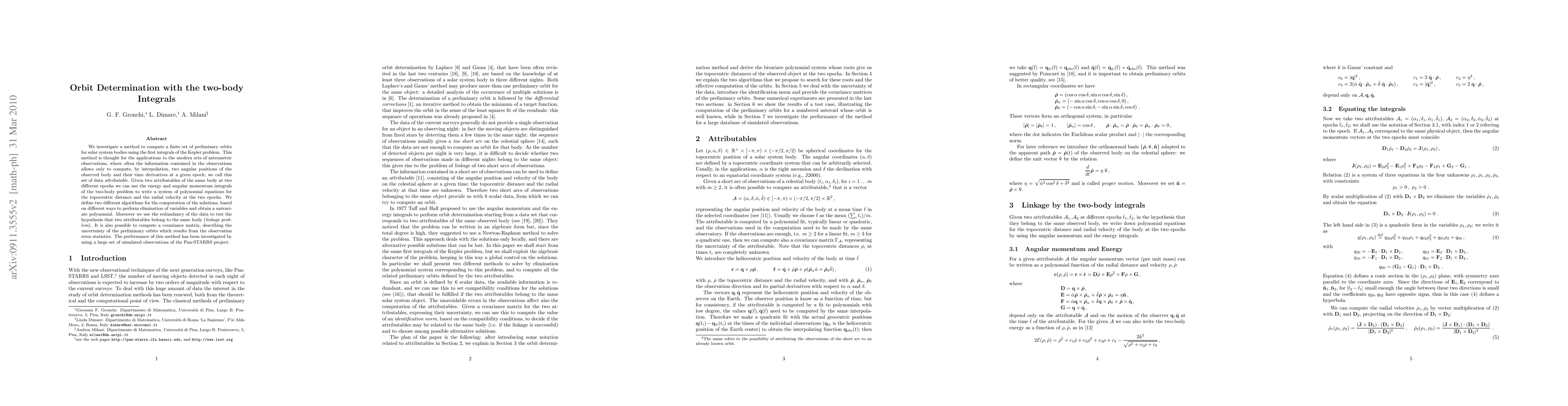 We investigate a method to compute a finite set of preliminary orbits for solar system bodies using the first integrals of the Kepler problem. This method is thought for the applications to the modern sets of astrometric observations, where often the information contained in the observations allows only to compute, by interpolation, two angular positions of the observed body and their time derivatives at a given epoch; we call this set of data attributable. Given two attributables of the same body at two different epochs we can use the energy and angular momentum integrals of the two-body problem to write a system of polynomial equations for the topocentric distance and the radial velocity at the two epochs. We define two different algorithms for the computation of the solutions, based on different ways to perform elimination of variables and obtain a univariate polynomial. Moreover we use the redundancy of the data to test the hypothesis that two attributables belong to the same body (linkage problem). It is also possible to compute a covariance matrix, describing the uncertainty of the preliminary orbits which results from the observation error statistics. The performance of this method has been investigated by using a large set of simulated observations of the Pan-STARRS project.