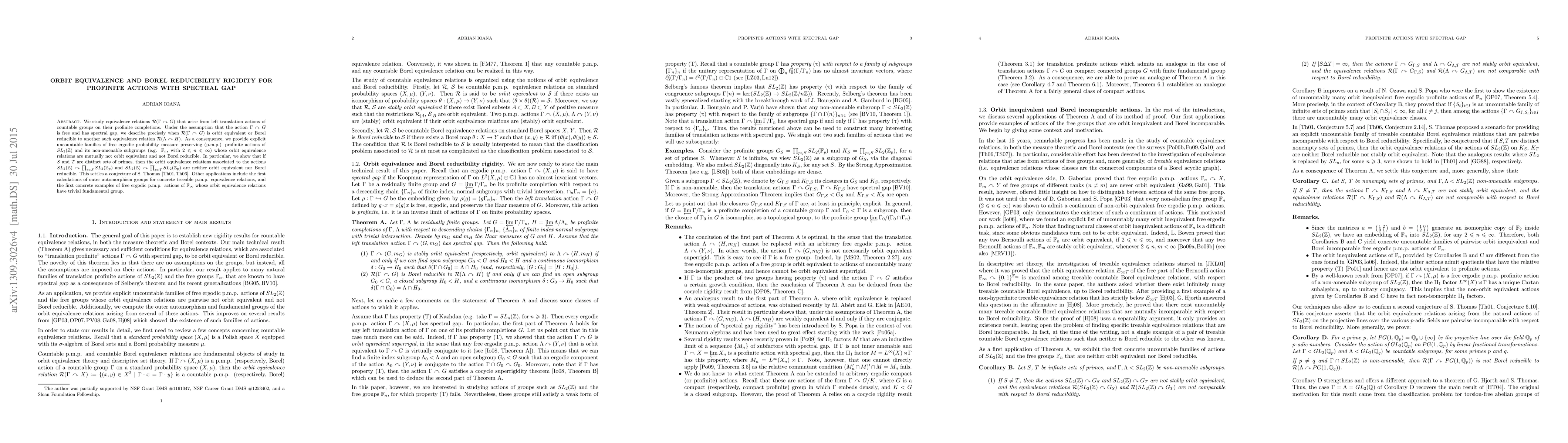 We study equivalence relations $\mathcal R(\Gamma\curvearrowright G)$ that arise from left translation actions of countable groups on their profinite completions. Under the assumption that the action $\Gamma\curvearrowright G$ is free and has spectral gap, we describe precisely when $\mathcal R(\Gamma\curvearrowright G)$ is orbit equivalent or Borel reducible to another such equivalence relation $\mathcal R(\Lambda\curvearrowright H)$. As a consequence, we provide explicit uncountable families of free ergodic probability measure preserving (p.m.p.) profinite actions of $SL_2(\mathbb Z)$ and its non-amenable subgroups (e.g. $\mathbb F_n$, with $2\leqslant n\leqslant\infty$) whose orbit equivalence relations are mutually not orbit equivalent and not Borel reducible. In particular, we show that if $S$ and $T$ are distinct sets of primes, then the orbit equivalence relations associated to the actions $SL_2(\mathbb Z)\curvearrowright\prod_{p\in S}SL_2(\mathbb Z_p)$ and $SL_2(\mathbb Z)\curvearrowright\prod_{p\in T}SL_2(\mathbb Z_p)$ are neither orbit equivalent nor Borel reducible. This settles a conjecture of S. Thomas \cite{Th06}. Other applications include the first calculations of outer automorphism groups for concrete treeable p.m.p. equivalence relations, and the first concrete examples of free ergodic p.m.p. actions of $\mathbb F_{\infty}$ whose orbit equivalence relations have trivial fundamental group.