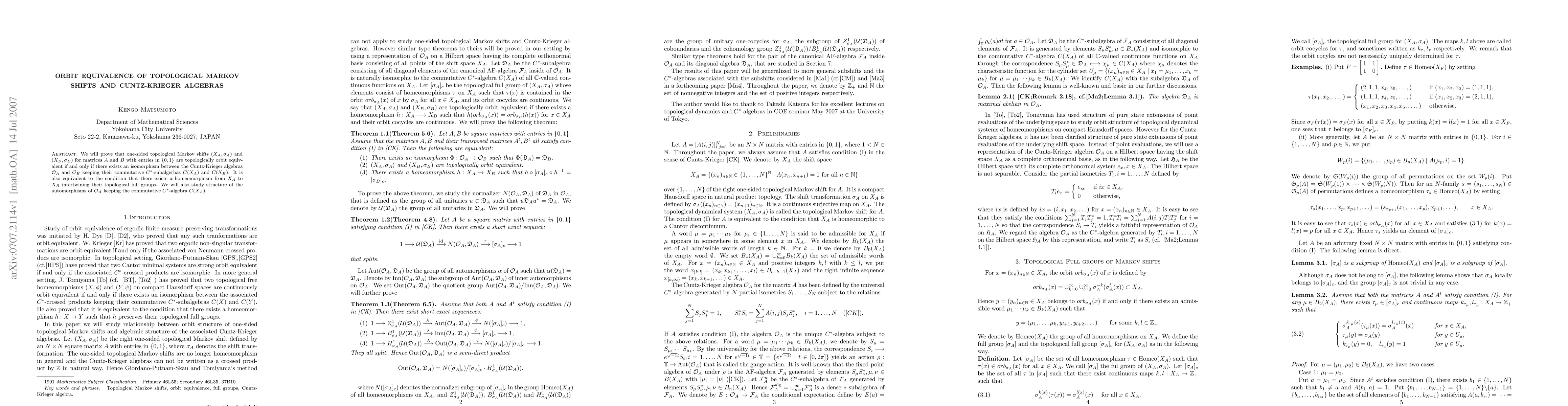 We will prove that one-sided topological Markov shifts $(X_A,\sigma_A)$ and $(X_B,\sigma_B)$ for matrices $A$ and $B$ with entries in $\{0,1\}$ are topologically orbit equivalent if and only if there exists an isomorphism between the Cuntz-Krieger algebras ${\Cal O}_A$ and ${\Cal O}_B$ keeping their commutative $C^*$-subalgerbas $C(X_A)$ and $C(X_B)$. It is also equivalent to the condition that there exists a homeomorphism from $X_A$ to $X_B$ intertwining their topological full groups. We will also study structure of the automorphisms of ${\Cal O}_A$ keeping the commutative $C^*$-algebra $C(X_A)$.