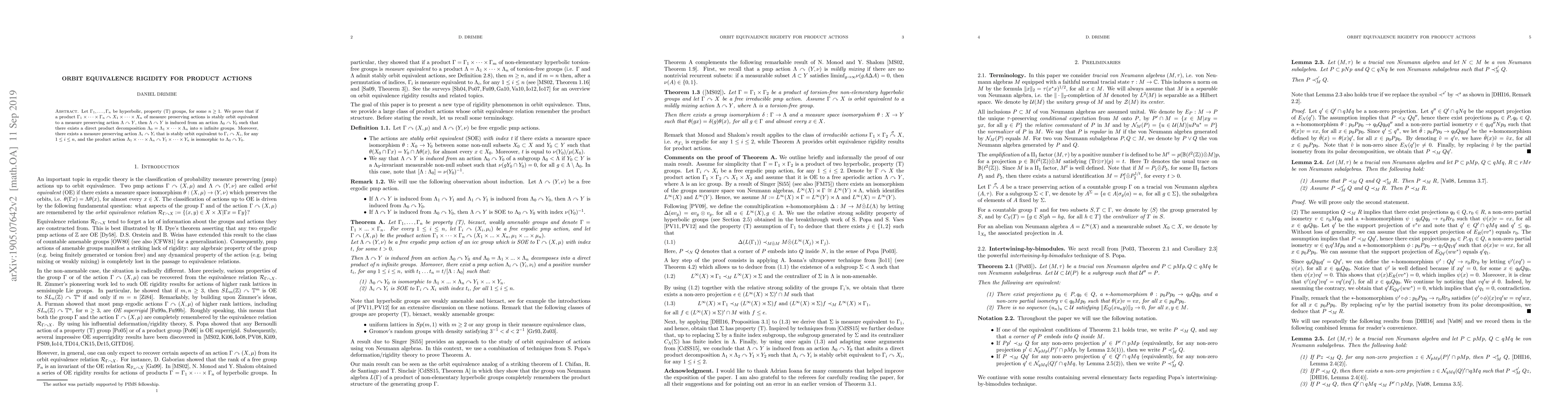 A product action of hyperbolic groups is stably orbit equivalent to a measure preserving action if it can be decomposed into a direct product of infinite groups with each component group being stably orbit equivalent to its corresponding action in the product.