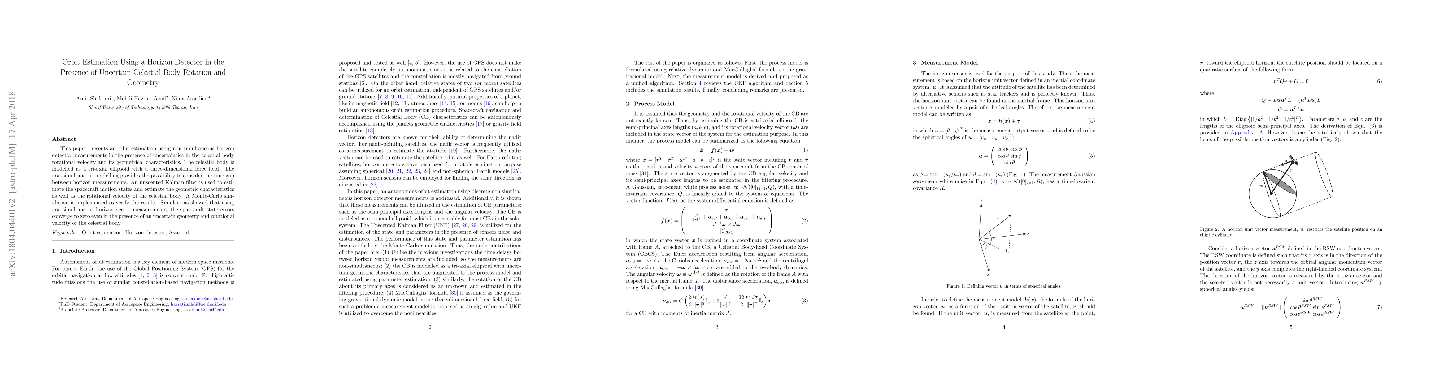 This paper proposes an orbit estimation method using non-simultaneous horizon detector measurements to account for uncertainties in celestial body rotation and geometry. An unscented Kalman filter is employed to estimate spacecraft states and celestial body characteristics, with simulations demonstrating convergence of state errors despite uncertainties.