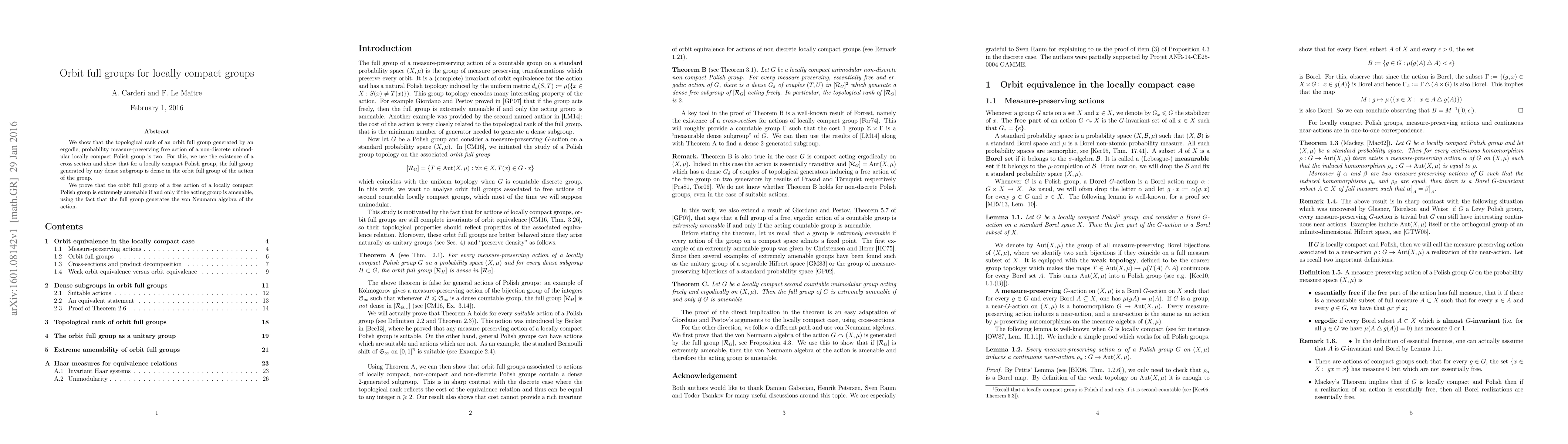 We show that the topological rank of an orbit full group generated by an ergodic, probability measure-preserving free action of a non-discrete unimodular locally compact Polish group is two. For this, we use the existence of a cross section and show that for a locally compact Polish group, the full group generated by any dense subgroup is dense in the orbit full group of the action of the group. We prove that the orbit full group of a free action of a locally compact Polish group is extremely amenable if and only if the acting group is amenable, using the fact that the full group generates the von Neumann algebra of the action.