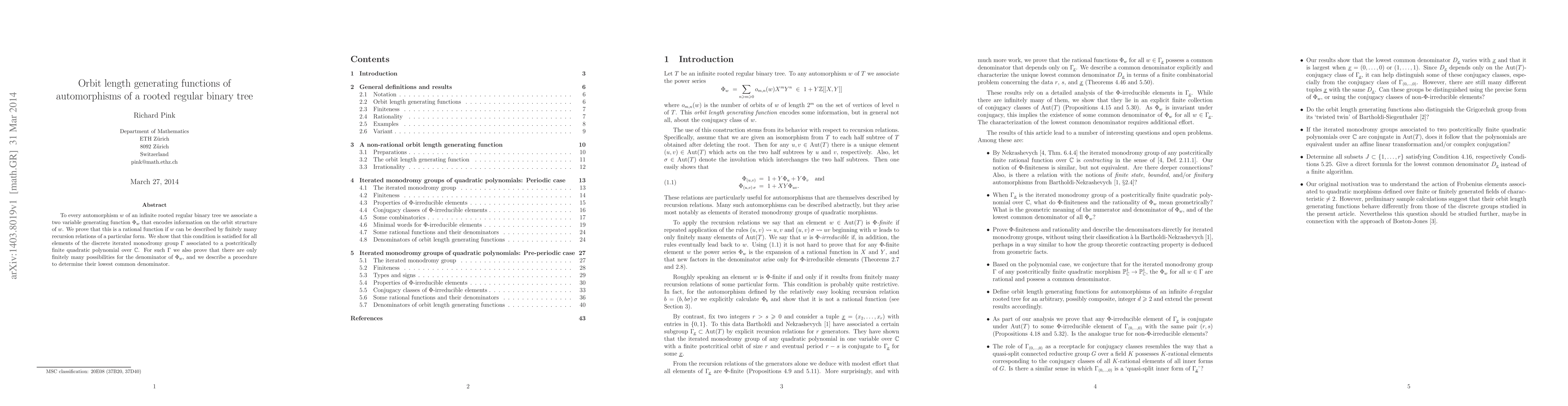 To every automorphism w of an infinite rooted regular binary tree we associate a two variable generating function \Phi_w that encodes information on the orbit structure of w. We prove that this is a rational function if w can be described by finitely many recursion relations of a particular form. We show that this condition is satisfied for all elements of the discrete iterated monodromy group \Gamma associated to a postcritically finite quadratic polynomial over C. For such \Gamma we also prove that there are only finitely many possibilities for the denominator of \Phi_w, and we describe a procedure to determine their lowest common denominator.
