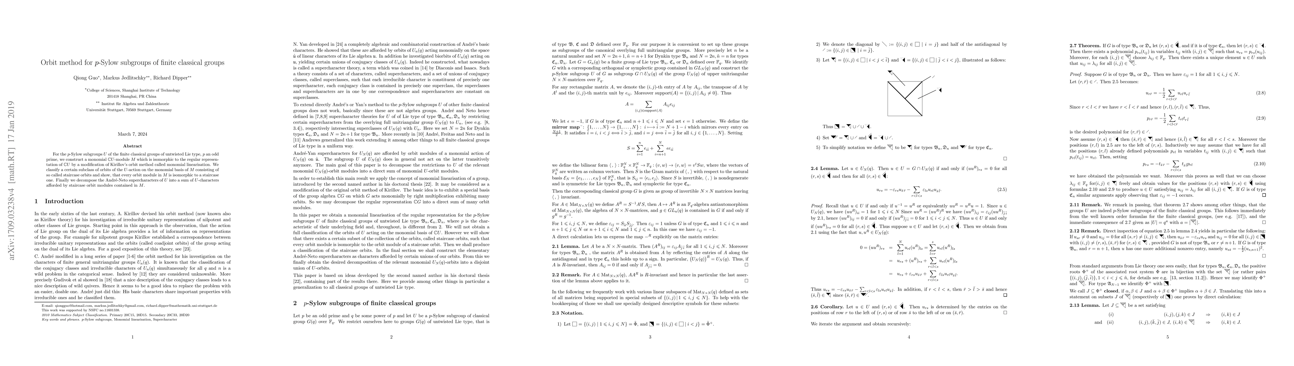 This paper constructs a monomial $\mathbb{C} U$-module $M$ for $p$-Sylow subgroups $U$ of finite classical groups, using a modified orbit method. It classifies a subclass of orbits, termed staircase orbits, showing that every orbit module in $M$ is isomorphic to a staircase one, and decomposes the André-Neto supercharacters of $U$ into $U$-characters from these modules.
