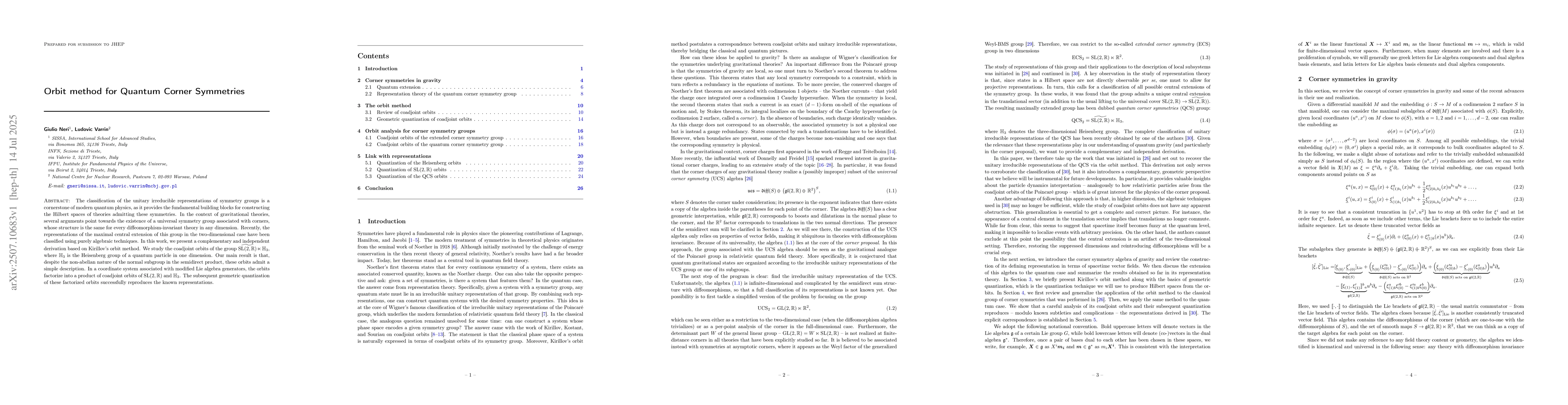 The classification of the unitary irreducible representations of symmetry groups is a cornerstone of modern quantum physics, as it provides the fundamental building blocks for constructing the Hilbert spaces of theories admitting these symmetries. In the context of gravitational theories, several arguments point towards the existence of a universal symmetry group associated with corners, whose structure is the same for every diffeomorphism-invariant theory in any dimension. Recently, the representations of the maximal central extension of this group in the two-dimensional case have been classified using purely algebraic techniques. In this work, we present a complementary and independent derivation based on Kirillov's orbit method. We study the coadjoint orbits of the group $\widetilde{\mathrm{SL}}(2,\mathbb{R})\ltimes\mathbb{H}_3$, where $\mathbb{H}_3$ is the Heisenberg group of a quantum particle in one dimension. Our main result is that, despite the non-abelian nature of the normal subgroup in the semidirect product, these orbits admit a simple description. In a coordinate system associated with modified Lie algebra generators, the orbits factorize into a product of coadjoint orbits of $\mathrm{SL}\left(2,\mathbb{R}\right)$ and $\mathbb{H}_3$. The subsequent geometric quantization of these factorized orbits successfully reproduces the known representations.