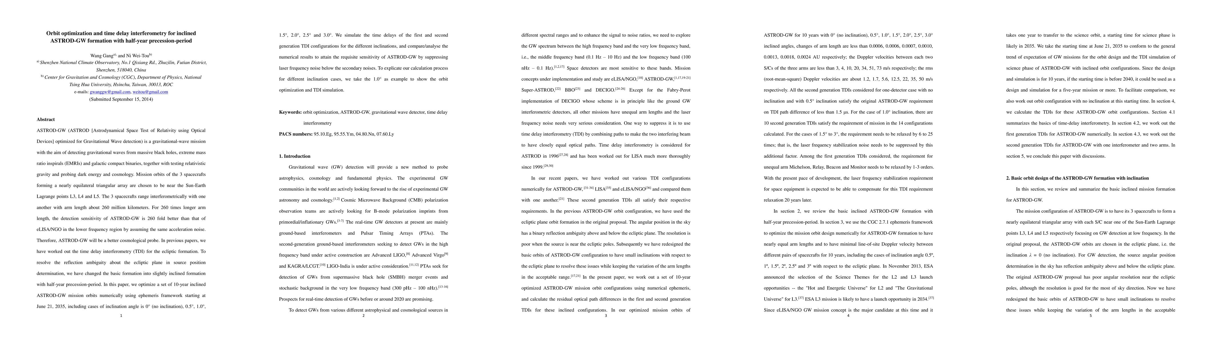ASTROD-GW (ASTROD [Astrodynamical Space Test of Relativity using Optical Devices] optimized for Gravitational Wave detection) is a gravitational-wave mission with the aim of detecting gravitational waves from massive black holes, extreme mass ratio inspirals (EMRIs) and galactic compact binaries, together with testing relativistic gravity and probing dark energy and cosmology. Mission orbits of the 3 spacecrafts forming a nearly equilateral triangular array are chosen to be near the Sun-Earth Lagrange points L3, L4 and L5. The 3 spacecrafts range interferometrically with one another with arm length about 260 million kilometers. For 260 times longer arm length, the detection sensitivity of ASTROD-GW is 260 fold better than that of eLISA/NGO in the lower frequency region by assuming the same acceleration noise. Therefore, ASTROD-GW will be a better cosmological probe. In previous papers, we have worked out the time delay interferometry (TDI) for the ecliptic formation. To resolve the reflection ambiguity about the ecliptic plane in source position determination, we have changed the basic formation into slightly inclined formation with half-year precession-period. In this paper, we optimize a set of 10-year inclined ASTROD-GW mission orbits numerically using ephemeris framework starting at June 21, 2035, including cases of inclination angle is 0{\deg} (no inclination), 0.5{\deg}, 1.0{\deg}, 1.5{\deg}, 2.0{\deg}, 2.5{\deg} and 3.0{\deg}. We simulate the time delays of the first and second generation TDI configurations for the different inclinations, and compare/analyse the numerical results to attain the requisite sensitivity of ASTROD-GW by suppressing laser frequency noise below the secondary noises. To explicate our calculation process for different inclination cases, we take the 1.0{\deg} as example to show the orbit optimization and TDI simulation.
