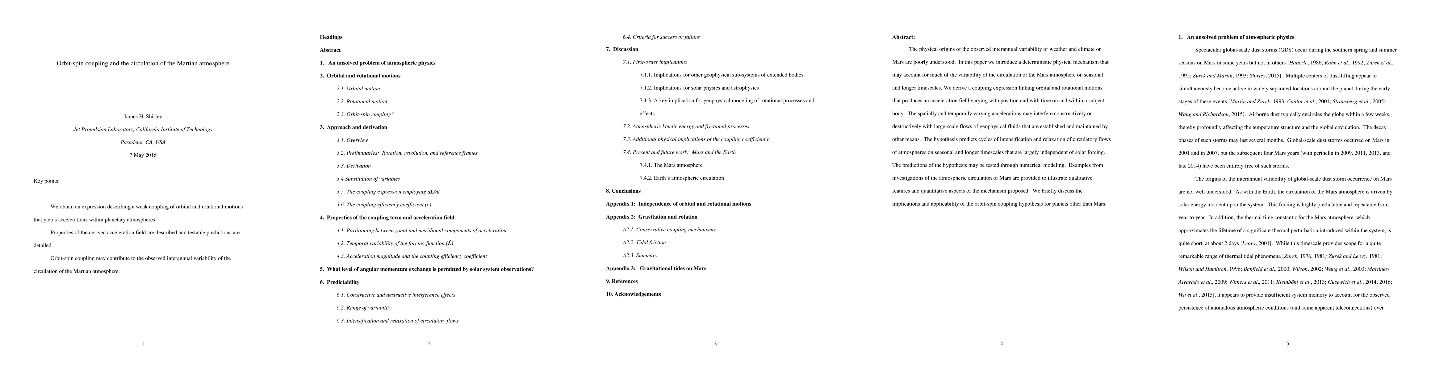 The physical origins of the observed interannual variability of weather and climate on Mars are poorly understood. In this paper we introduce a deterministic physical mechanism that may account for much of the variability of the circulation of the Mars atmosphere on seasonal and longer timescales. We derive a coupling expression linking orbital and rotational motions that produces an acceleration field varying with position and with time on and within a subject body. The spatially and temporally varying accelerations may interfere constructively or destructively with large-scale flows of geophysical fluids that are established and maintained by other means. The hypothesis predicts cycles of intensification and relaxation of circulatory flows of atmospheres on seasonal and longer timescales that are largely independent of solar forcing. The predictions of the hypothesis may be tested through numerical modeling. Examples from investigations of the atmospheric circulation of Mars are provided to illustrate qualitative features and quantitative aspects of the mechanism proposed. We briefly discuss the implications and applicability of the orbit-spin coupling hypothesis for planets other than Mars.