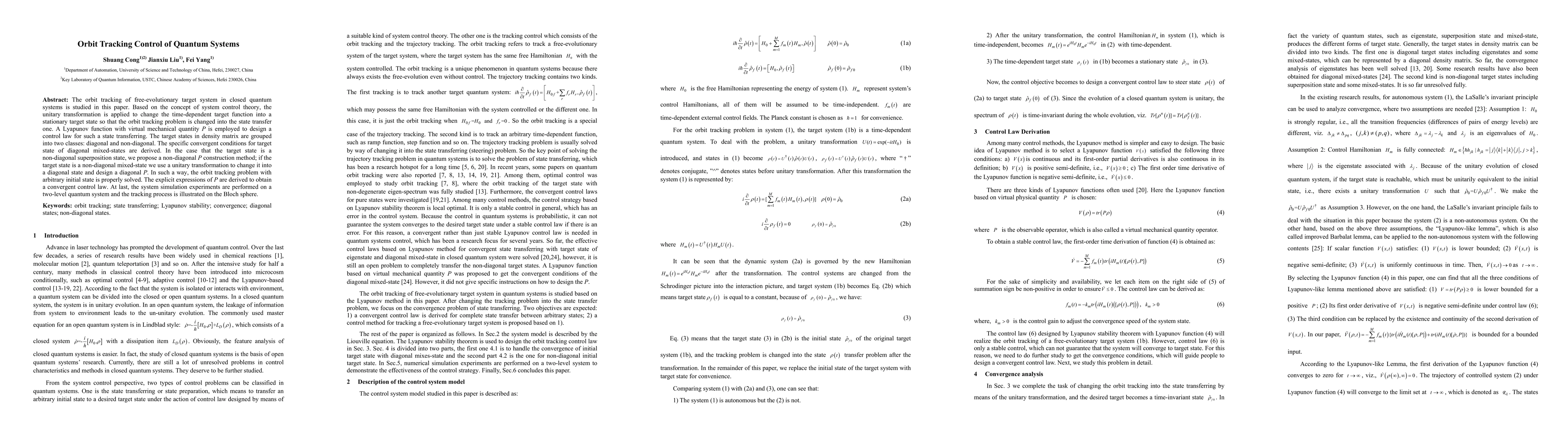 The orbit tracking of free-evolutionary target system in closed quantum systems is studied in this paper. Based on the concept of system control theory, the unitary transformation is applied to change the time-dependent target function into a stationary target state so that the orbit tracking problem is changed into the state transfer one. A Lyapunov function with virtual mechanical quantity P is employed to design a control law for such a state transferring. The target states in density matrix are grouped into two classes: diagonal and non-diagonal. The specific convergent conditions for target state of diagonal mixed-states are derived. In the case that the target state is a non-diagonal superposition state, we propose a non-diagonal P construction method; if the target state is a non-diagonal mixed-state we use a unitary transformation to change it into a diagonal state and design a diagonal P. In such a way, the orbit tracking problem with arbitrary initial state is properly solved. The explicit expressions of P are derived to obtain a convergent control law. At last, the system simulation experiments are performed on a two-level quantum system and the tracking process is illustrated on the Bloch sphere.