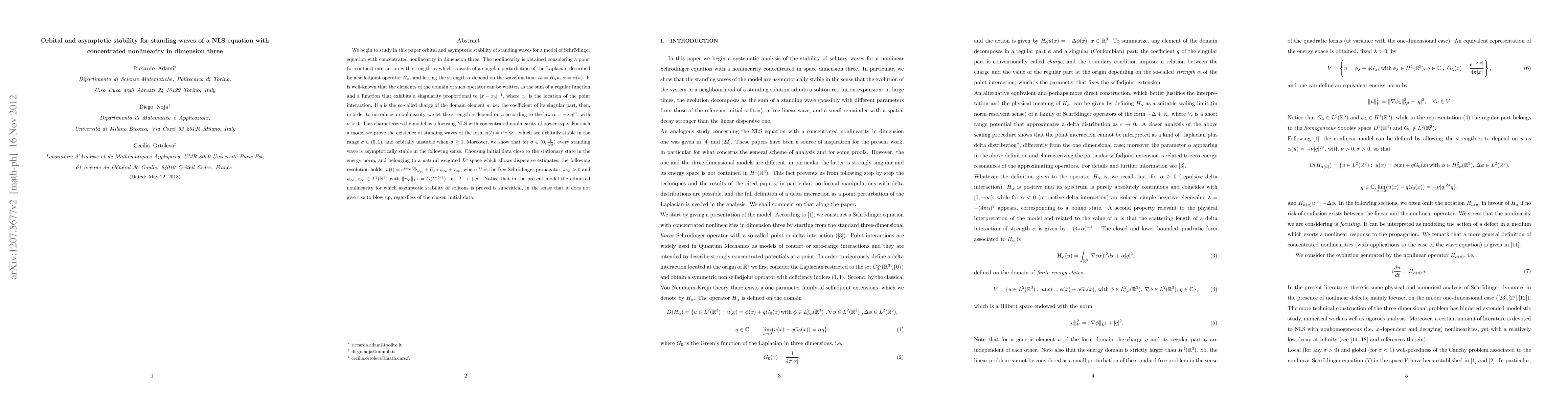 This paper investigates the orbital and asymptotic stability of standing waves for a nonlinear Schrödinger equation with concentrated nonlinearity in three dimensions. The authors prove that standing waves are orbitally stable for certain parameter ranges and asymptotically stable under specific conditions, demonstrating that the nonlinearity must be subcritical for asymptotic stability.