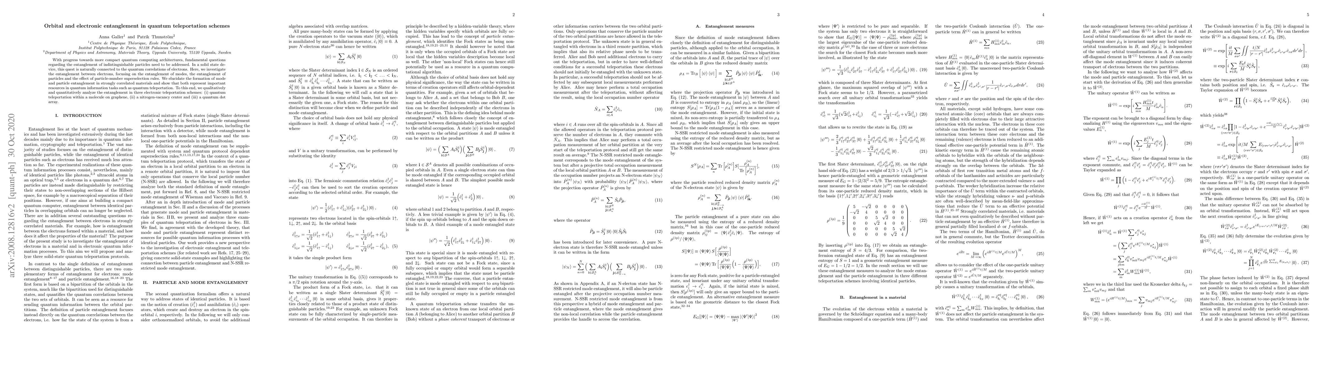 With progress towards more compact quantum computing architectures, fundamental questions regarding the entanglement of indistinguishable particles need to be addressed. In a solid state device, this quest is naturally connected to the quantum correlations of electrons. Here, we investigate the entanglement between electrons, focusing on the entanglement of modes, the entanglement of particles and the effect of particle-number superselection rules. We elucidate the formation of mode and particle entanglement in strongly correlated materials and show that both represent important resources in quantum information tasks such as quantum teleportation. To this end, we qualitatively and quantitatively analyze the entanglement in three electronic teleportation schemes: (i) quantum teleportation within a molecule on graphene, (ii) a nitrogen-vacancy center and (iii) a quantum dot array.