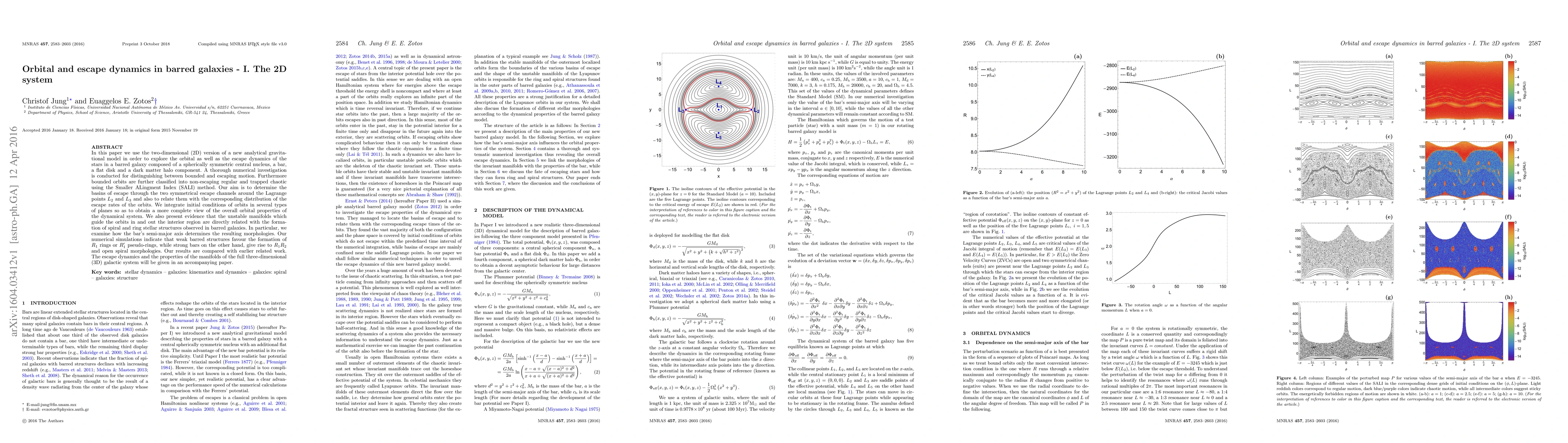This paper investigates the orbital dynamics in barred galaxies using a 2D gravitational model, classifying orbits as bounded or escaping and identifying escape channels around Lagrange points. It finds that weak bars favor $R_1$ rings or pseudo-rings, while strong bars lead to $R_1R_2$ and open spiral structures.